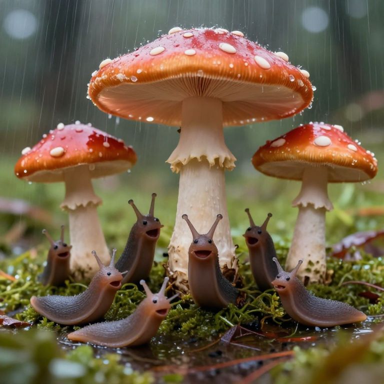 In a world where whimsy meets resilience, sentient slugs find solace beneath mushroom umbrellas, their laughter and songs weaving a symphony of hope and connection amidst the rhythmic embrace of rainfall.