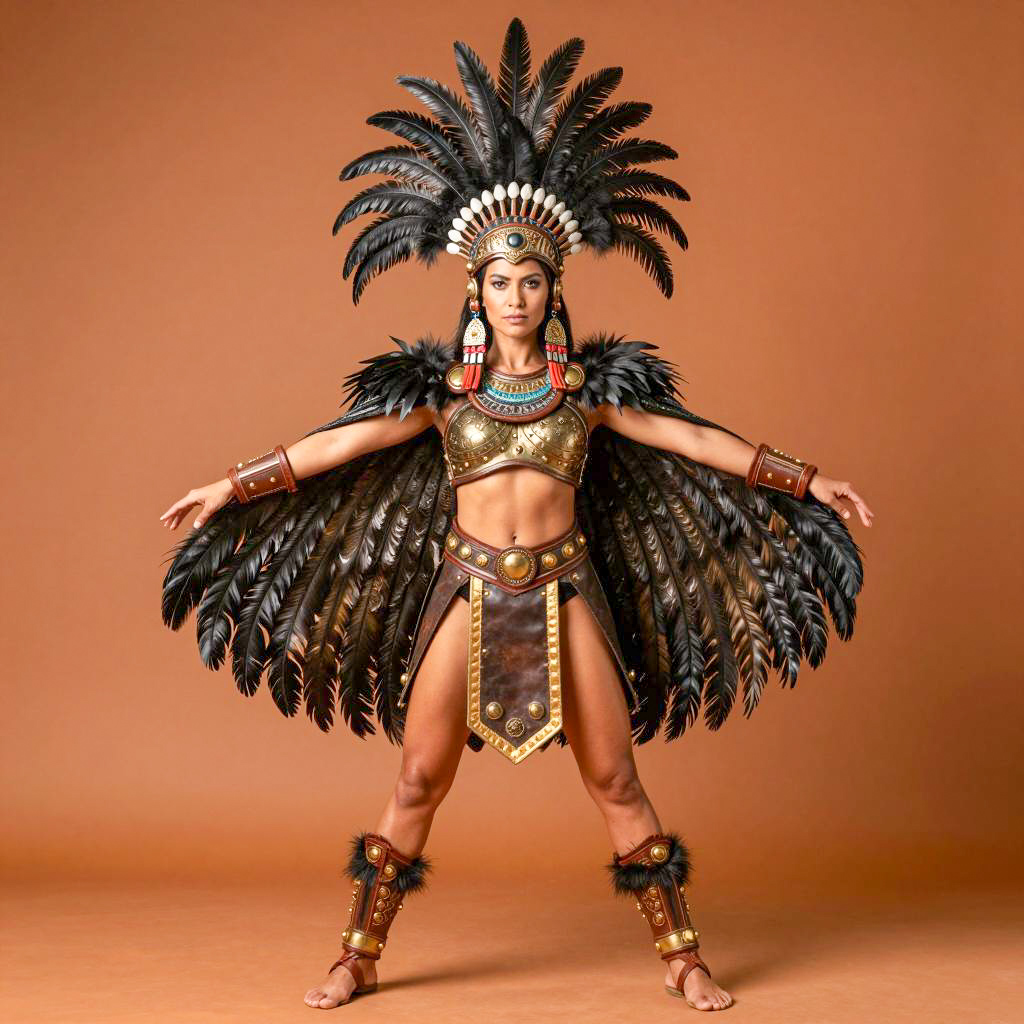 Full body shot of a woman wearing a detailed Aztec-style ancient warrior costume, featuring a large black feathered headdress, matching feathered cape, bronze chest armor, dark brown leather skirt with gold trim, leather arm cuffs, and sandals. The costume exposes the midriff and showcases traditional ethnic design elements with dramatic feathers, photographed against an orange backdrop with warm studio lighting.