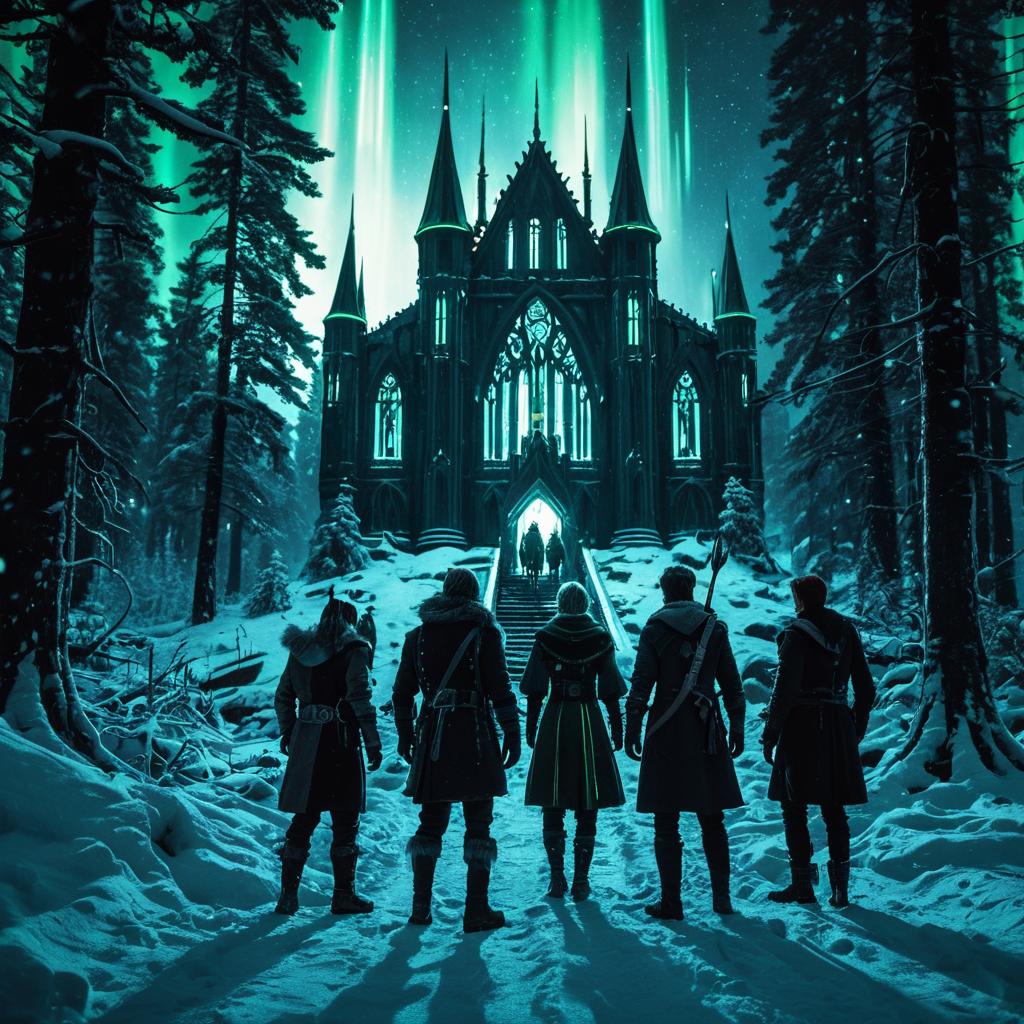 A group of elves dressed in dark, fur-lined cloaks stands in a snowy boreal forest, facing a gothic-style castle with tall spires. The scene is illuminated by bioluminescent neon aurora lights in the night sky, blending neo-noir cyberpunk and fantasy elements. The atmosphere is cinematic and immersive, highlighting detailed, realistic textures in an 8k resolution fantasy setting.