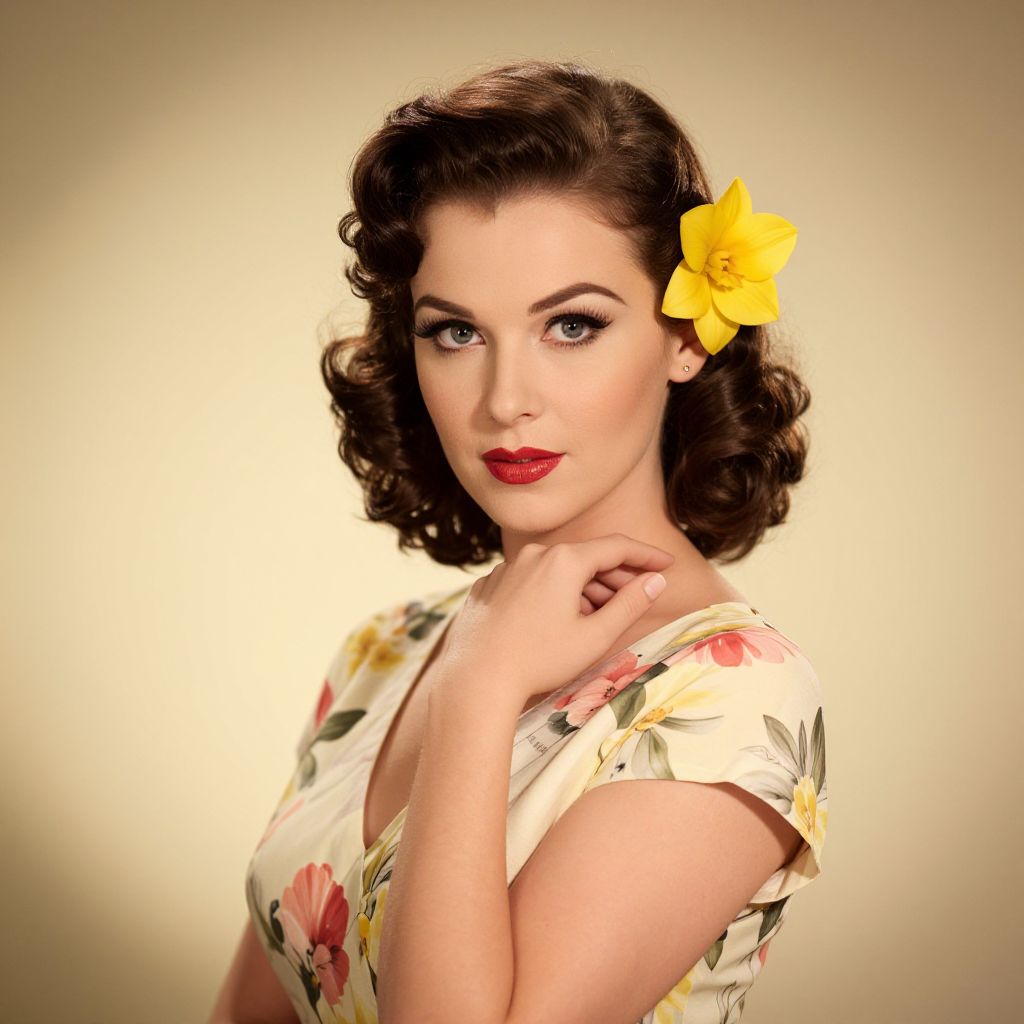 A woman with vintage hairstyle and makeup poses against a softly lit background, showcasing classic 1950s glamour. She wears a floral dress accented with a yellow flower in her hair, highlighting a retro-inspired look with elegant sophistication.