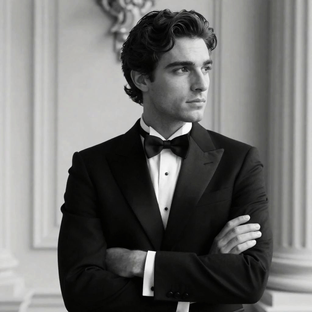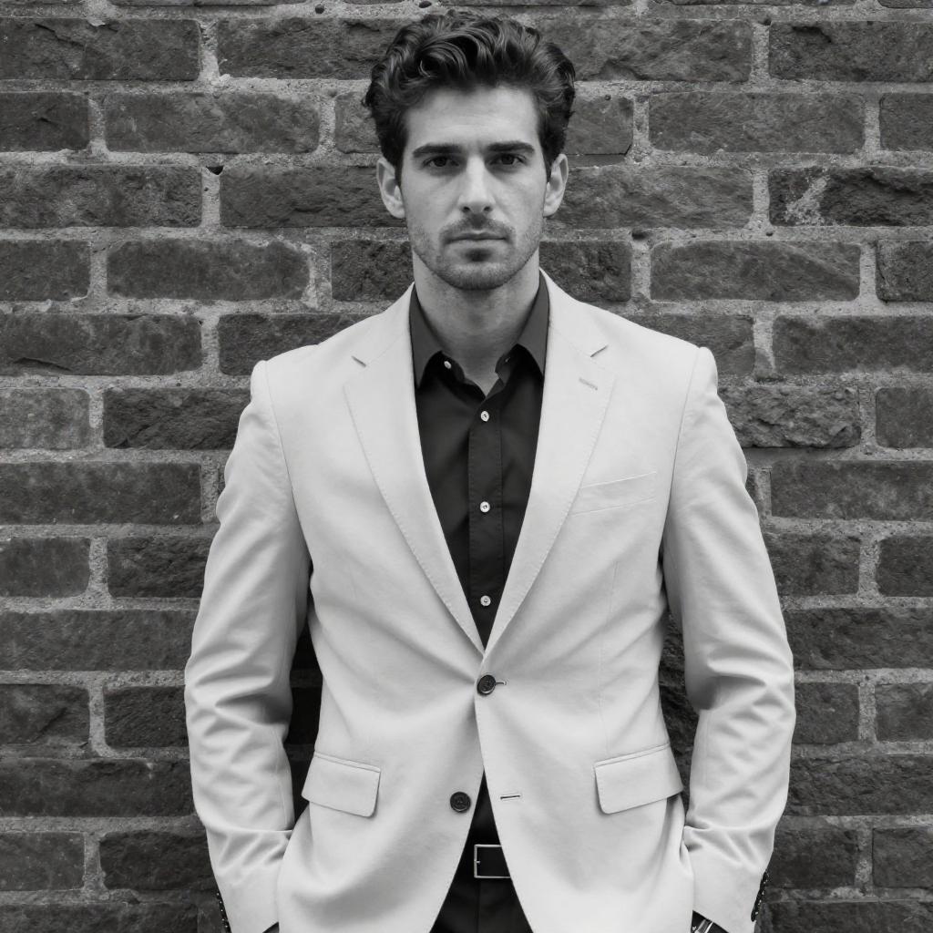 Black and white photograph of a man in a light-colored suit and tie, standing against a blurred background. He has dark, wavy hair, a slight smile, and a pocket square. His hands rest at his sides. The suit is well-fitted.