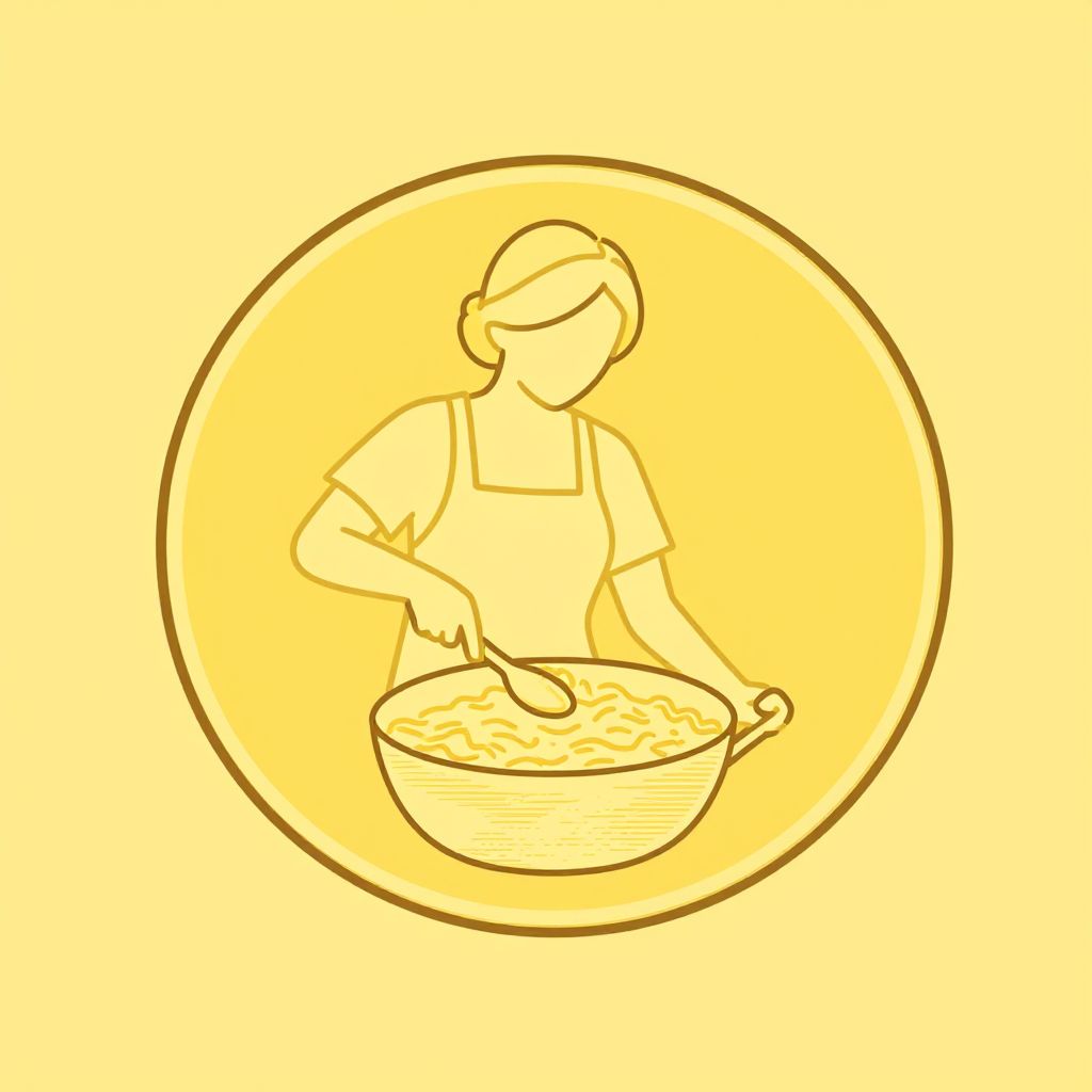Minimalistic wireframe-style circular logo featuring a lady cooking mie noodles, designed in a flat, yellow-themed illustration resembling the style of the Starbucks logo.