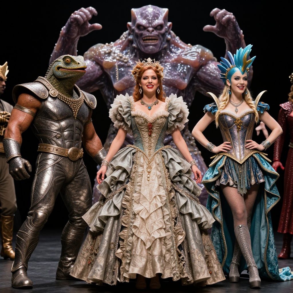 The image features a dynamic and theatrical scene with a group of characters, each with unique and elaborate costumes. In the center stands a woman in a voluminous, ruffled dress, her attire adorned with intricate details and textures. To her left, a muscular lizard man in a metallic suit exudes strength and confidence. To her right, an anthropomorphic fish woman in a corset and skirt showcases a blend of aquatic and human elements. Behind her, a towering, gelatinous cube creature looms, its form both menacing and otherworldly. The characters are arranged in a semi-circle, their poses and expressions conveying a sense of unity and purpose. The overall composition is rich in color and texture, with the characters' costumes and accessories adding depth and complexity to the scene. The lighting highlights the details of their attire, creating a dramatic and visually striking effect.