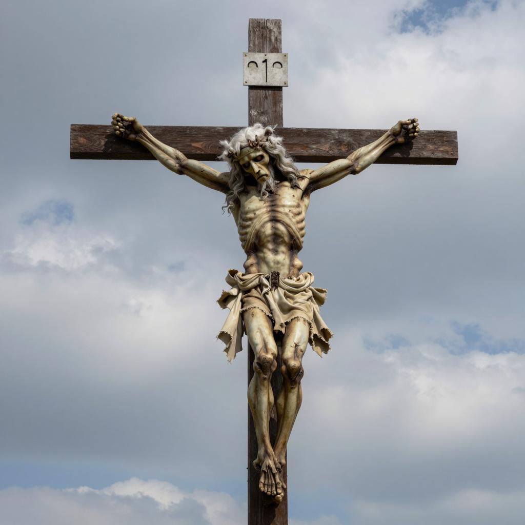 Shriveled, skeletal figure with long, curly white hair hangs from a wooden cross. His arms are outstretched, and his legs are slightly bent. He wears tattered beige shorts. The background is a cloudy, blue-gray sky. The cross is brown and ured. The figure's face is gaunt and expressionless.