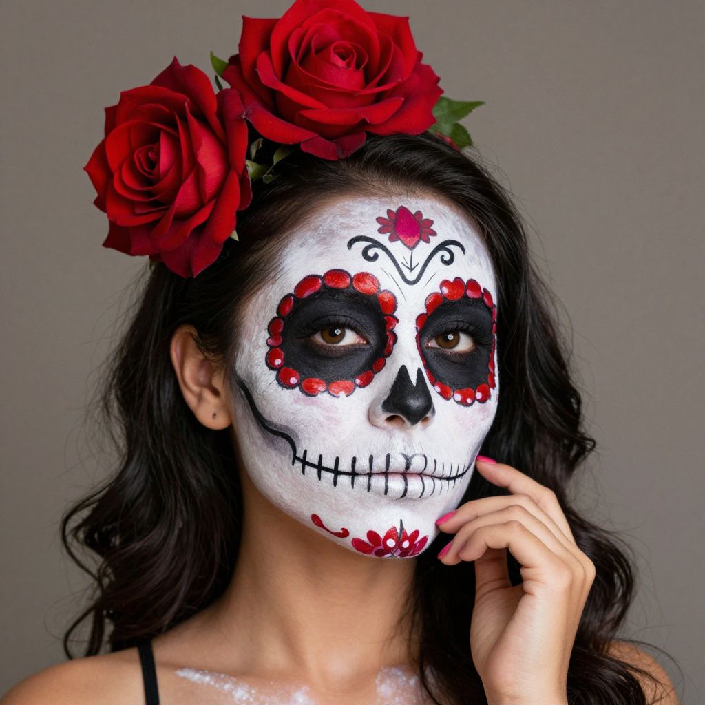 Woman showcasing vibrant sugar skull makeup with intricate designs, bold red accents, and two large red roses adorning her hair, creating a striking blend of tradition and creativity.