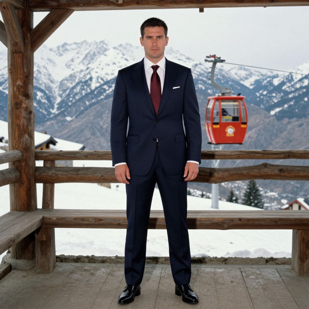 A man, silk blend navy suit, crisp white dress shirt, deep burgundy silk tie, polished black leather shoes, tailored fit, rustic wooden station, snow-capped mountains, vibrant red cable cars, kodacolor analog film, confident expression. Man has masculine face and piercing eyes