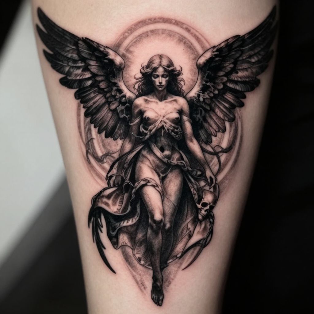 Angel and death tattoo design, intricate black and gray ink with contrasting light and dark elements, ethereal angel wings merging with skeletal death figure, detailed shading, mystical aura, gothic art style, high contrast, tattoo flash art