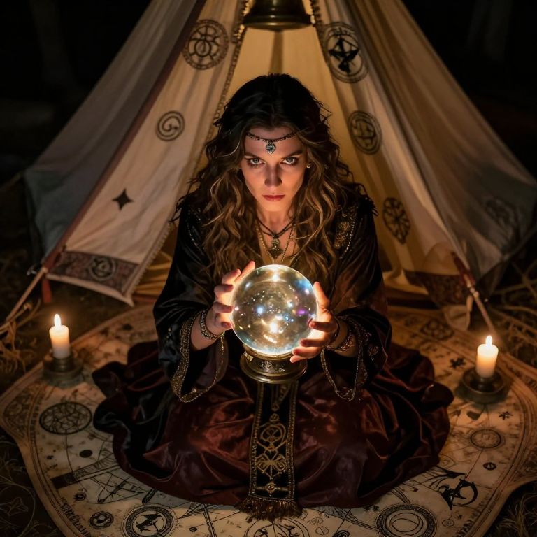 Photograph of a young woman with long, wavy brown hair and intense blue eyes, sitting cross-legged on a magical circular rug with symbols. She wears a black, medieval-style dress with intricate embroidery, and a silver gemstone forehead piece. She holds a glowing, transparent crystal ball, illuminating her face. The background features a large, white tent with pentagram designs. Two lit candles flank her, casting a warm, flickering light. The dark, shadowy background contrasts with the soft, glowing light from the candles and crystal ball, creating a mystical, enchanted atmosphere.
