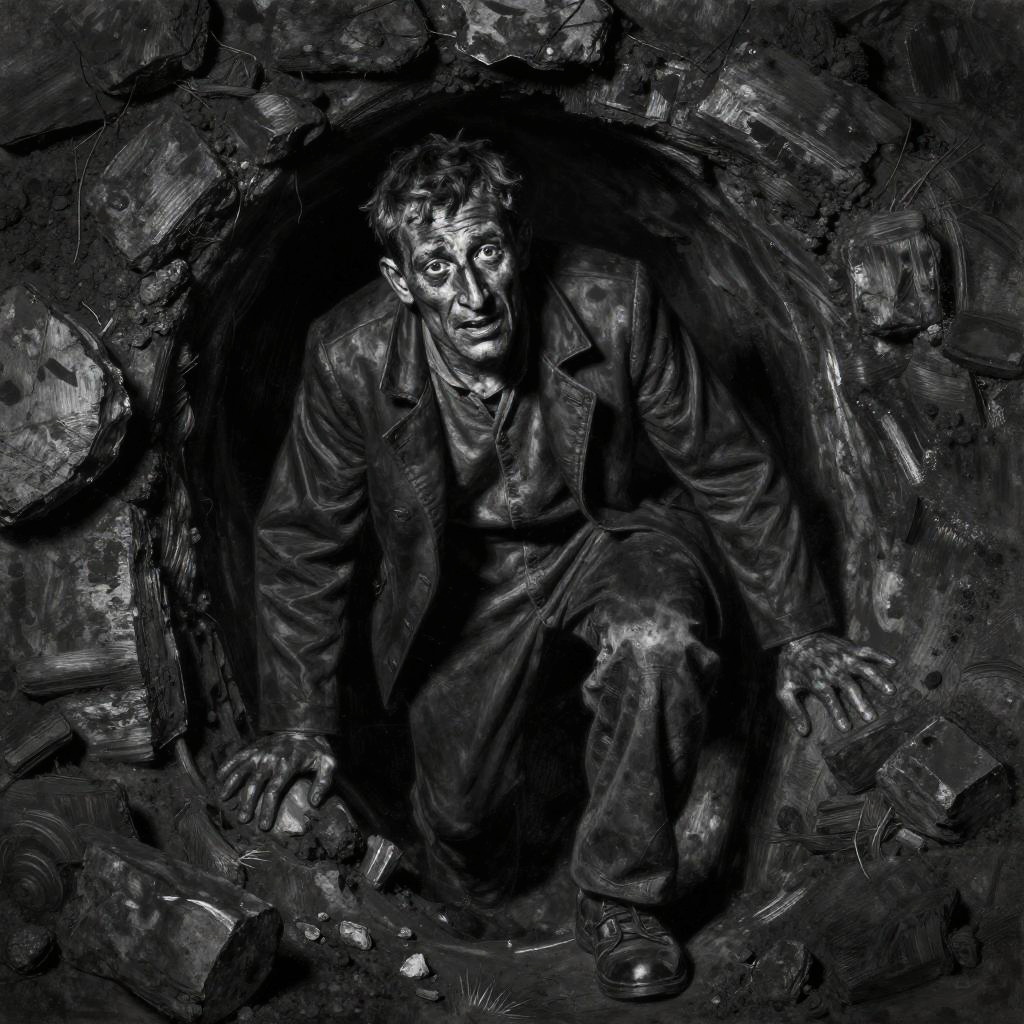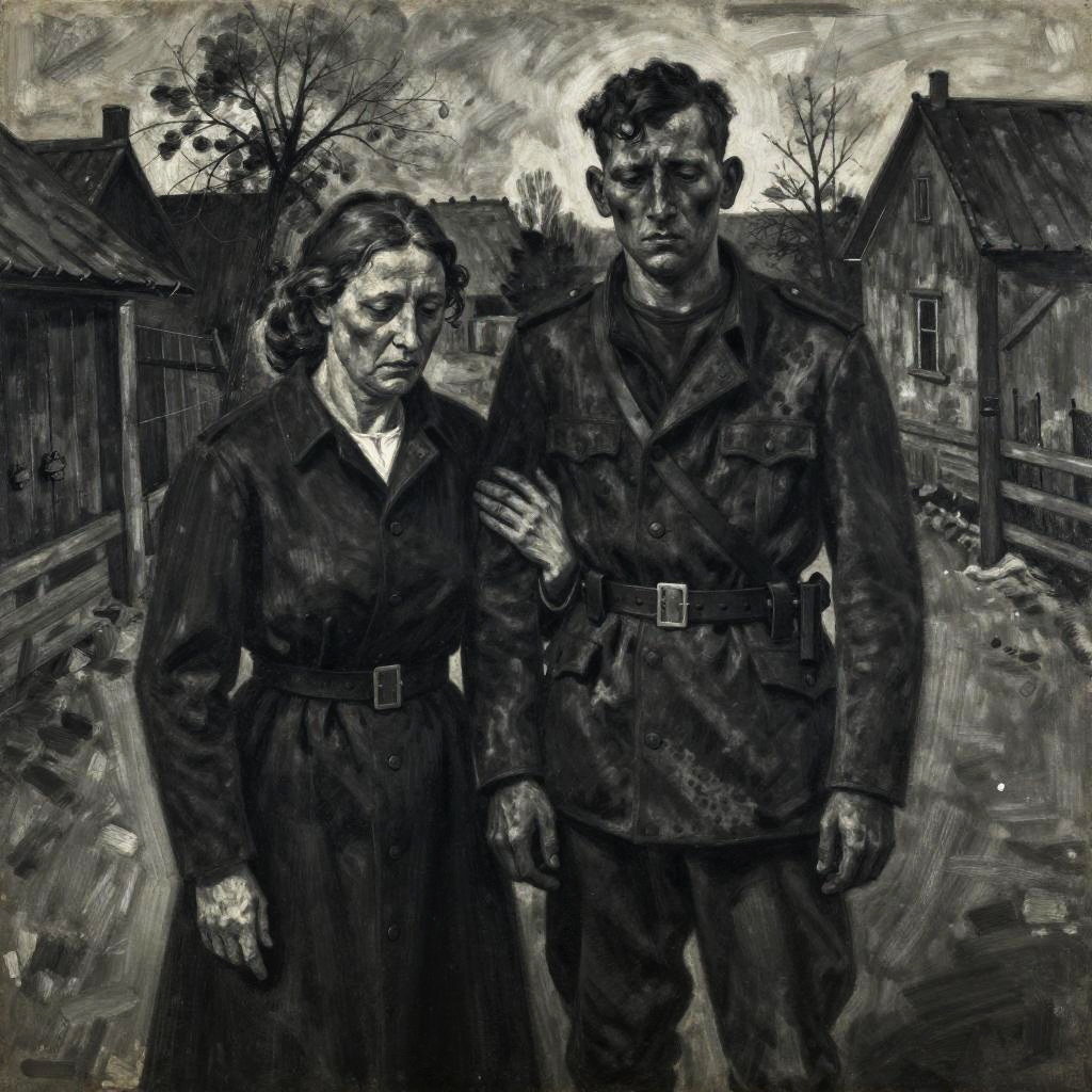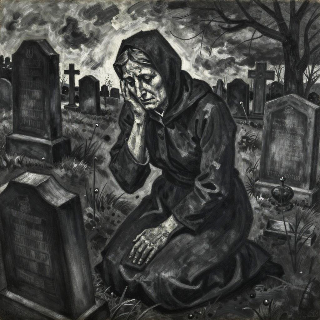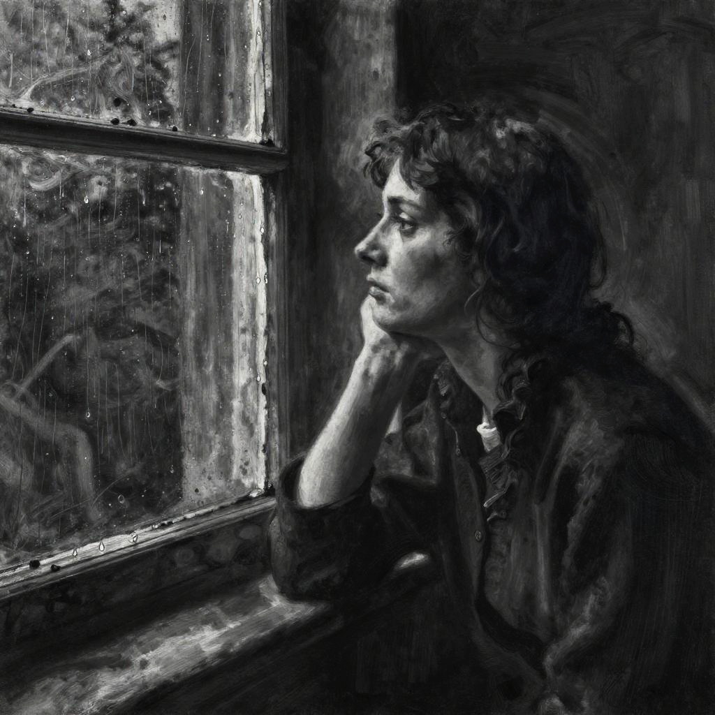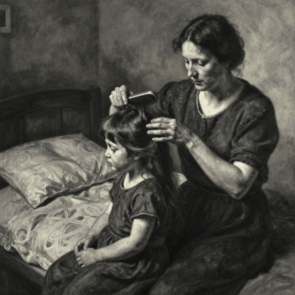 Monochrome charcoal painting depicting a wet nurse tenderly cradling a baby in a modest nursery setting. The artwork features gentle lines and soft textures, capturing nurturing warmth and protective affection. The muted lighting and dramatic, expressive style emphasize emotional depth and intimate connection between the subjects.