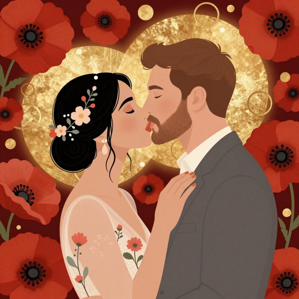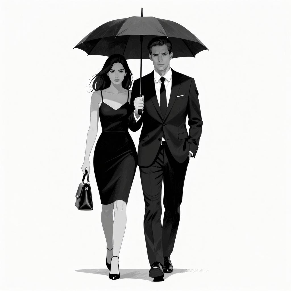 Illustration of a couple under a red umbrella. Woman with long black hair, white and black dress, black leggings, one leg raised. Man in black suit, white shirt, black tie, short black hair. Grey, ured background with vertical stains. Woman and man kissing, arms around each other. Woman's dress flows downward, man's suit fits snugly. Woman's left leg extended upward, man's right hand on her waist, left hand on her back. Red umbrella centered above their heads.