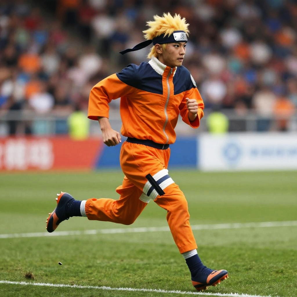 Soccer Naruto running on a vibrant soccer field, wearing his traditional orange ninja outfit mixed with sporty cleats, bright dynamic action shot with stadium crowd in the background