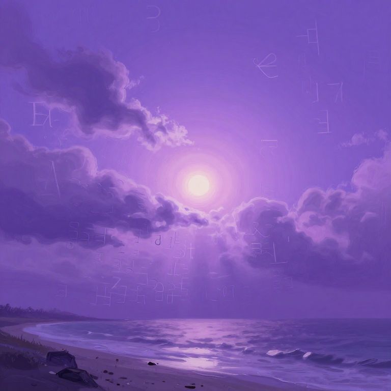 A surreal digital artwork captures a dreamlike coastal landscape under a vibrant violet sky, where ethereal clouds and a radiant celestial burst evoke a mystical atmosphere, blending impressionistic textures with cyberpunk-inspired hues, inviting viewers to decipher the fleeting runes etched by the wind in this otherworldly scene.