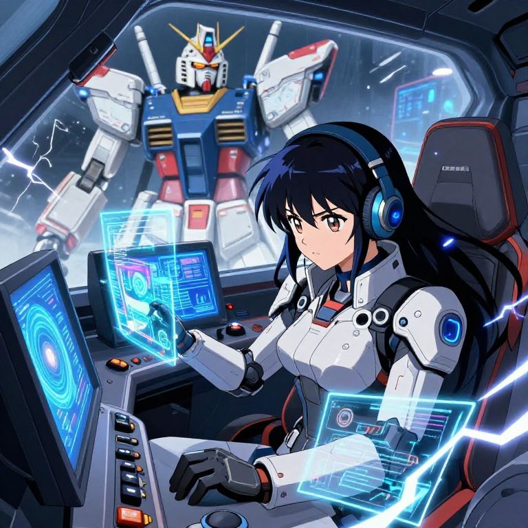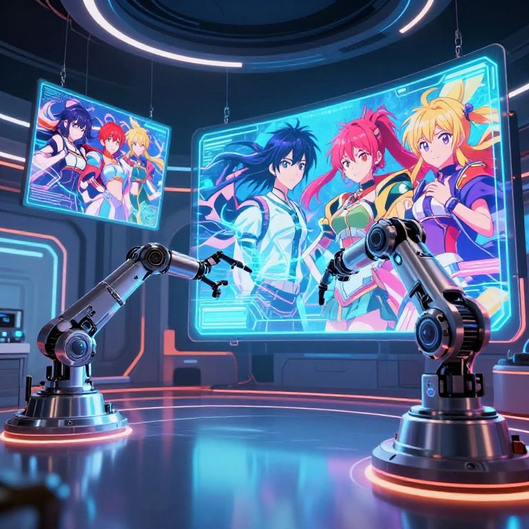 Anime image AI generator showcasing a futuristic studio with holographic screens displaying vibrant anime characters, intricate robotic arms painting in midair, and neon lights reflecting off sleek chrome surfaces, digital art with high detail and rich colors.