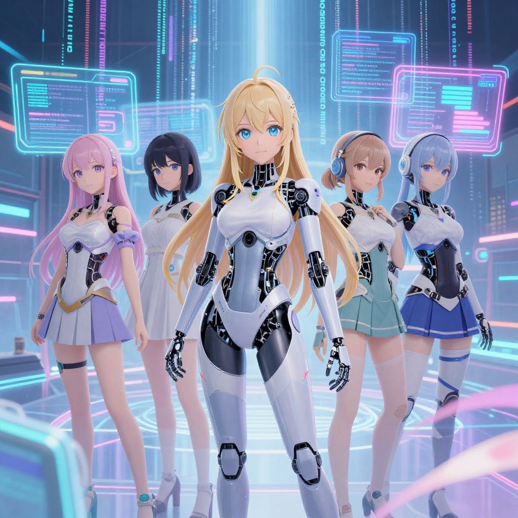 Digital anime-style artwork of a futuristic control room with robotic arms pointing at vibrant, glowing screens displaying five colorful anime characters.