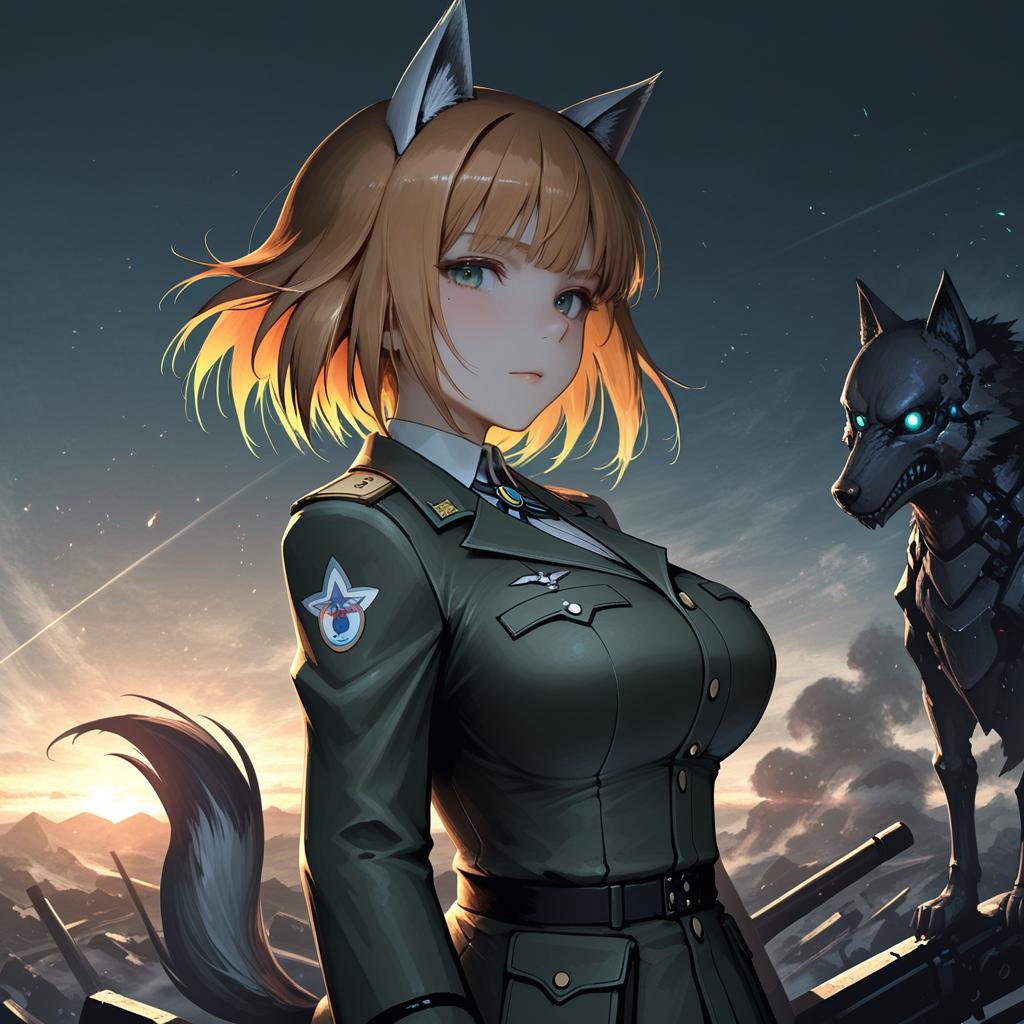Digital artwork of a female anime character with wolf ears and tail, standing confidently in a military uniform. She has short brown and orange hair, and heterochromatic eyes - one blue and one green. A robotic wolf with glowing blue eyes accompanies her against a dramatic sunset backdrop featuring mountains and debris.