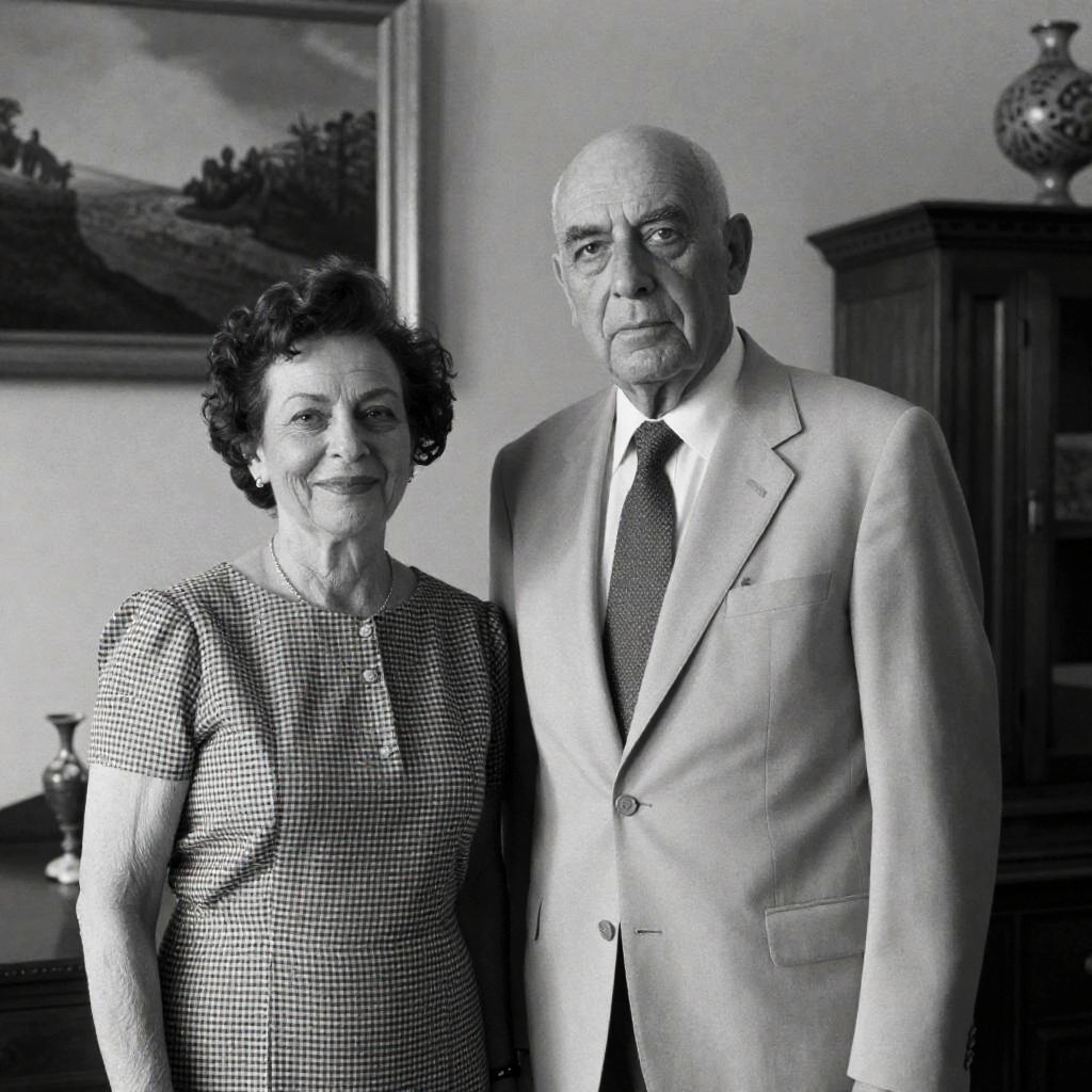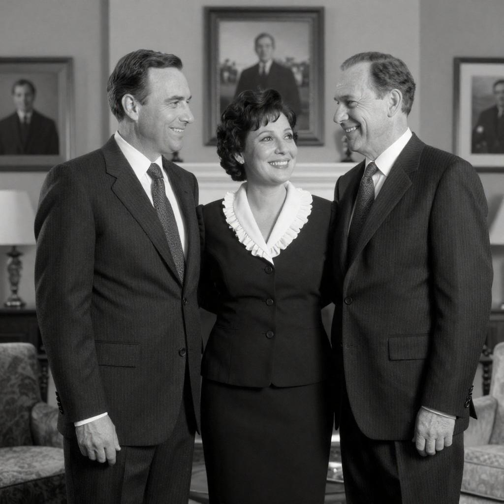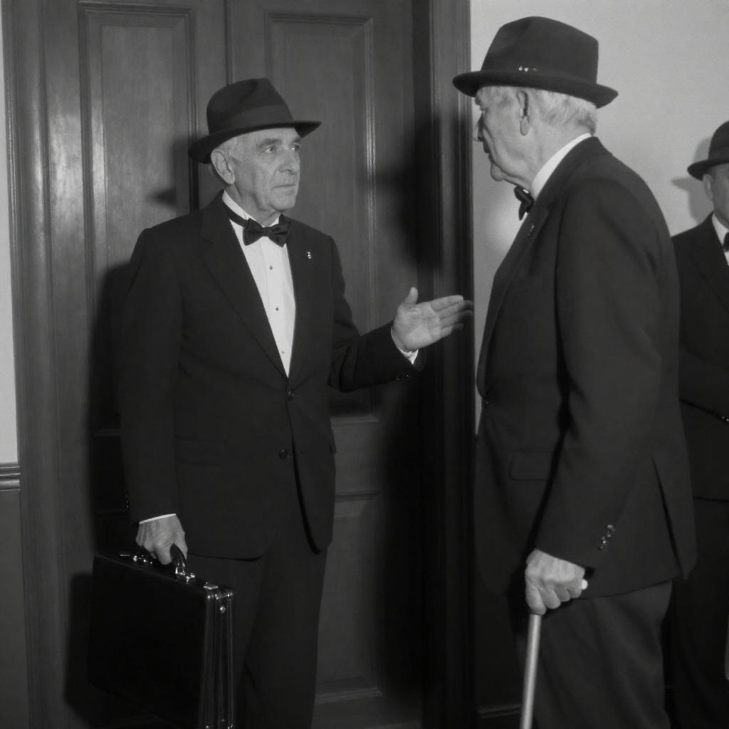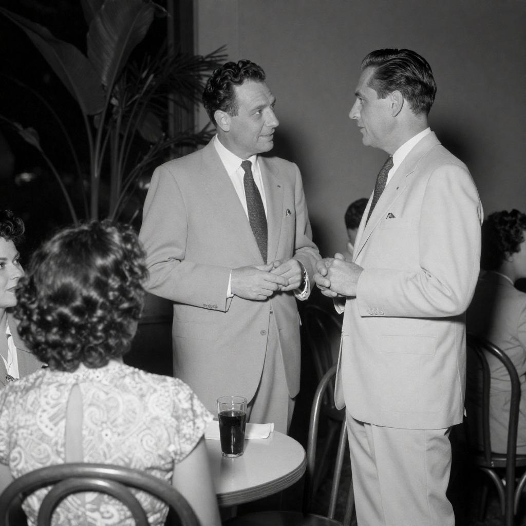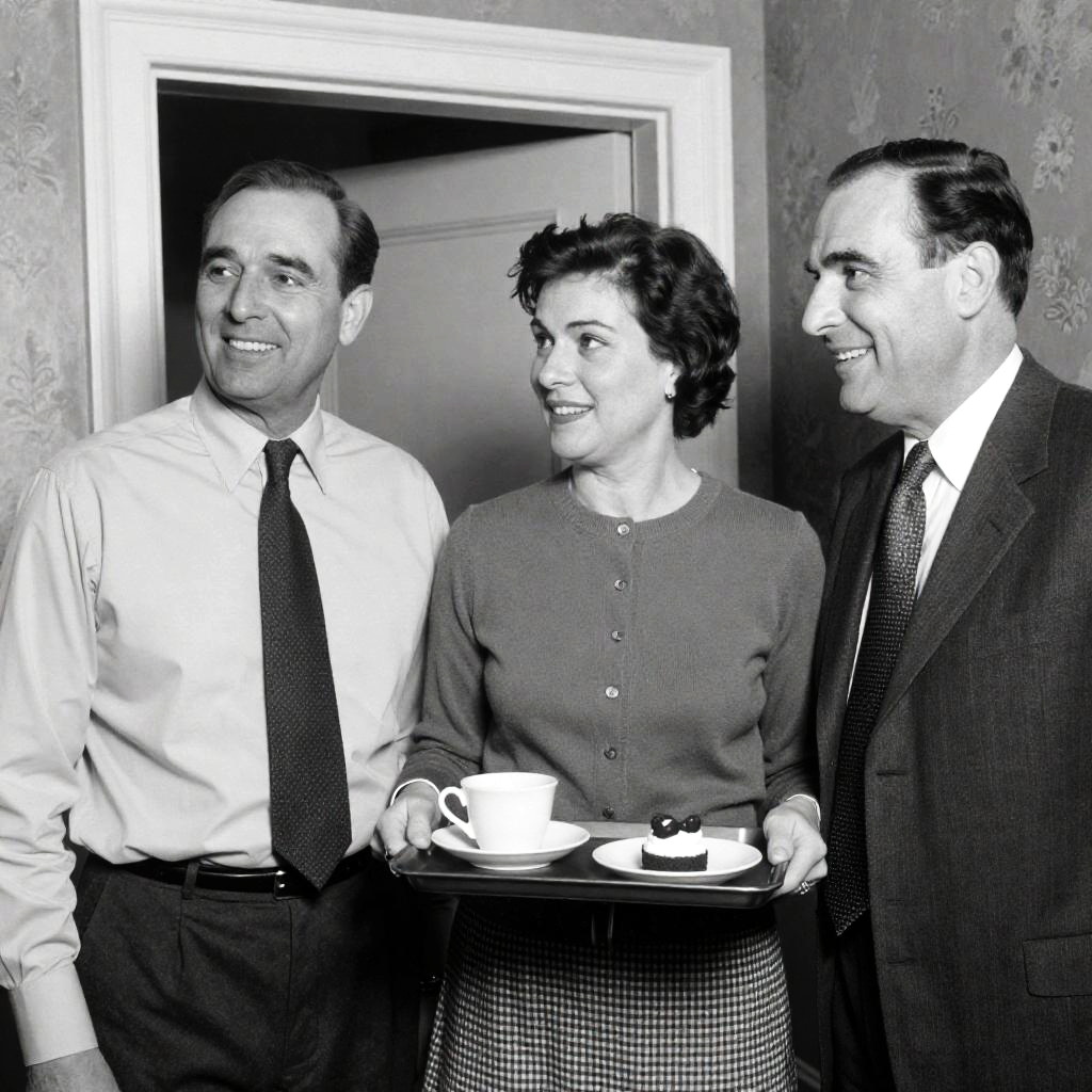 Black and white photograph of three people. Man in pinstripe suit, holding glass, speaking to elderly woman with curly hair and floral dress, holding plate. Woman with headscarf, sleeveless dress, and necklace, leaning forward, gesturing. Background with furniture and window.