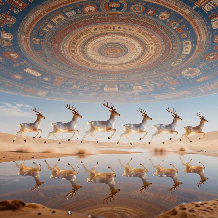 A herd of floating, translucent deer gallops effortlessly through the air above a mirrored desert where the sky is printed like a rotating fresco of forgotten civilizations.