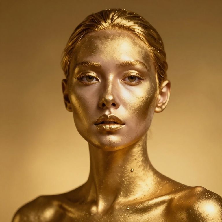 The image features a striking portrait of a person with a beautifully detailed, hyper-realistic appearance. The individual's face and shoulders are adorned with a glossy, metallic gold finish that reflects light in a captivating manner, creating a sense of depth and dimension. The background is a gradient of warm, golden hues, reminiscent of the bottom of a quail eggshell, enhancing the overall luxurious and ethereal atmosphere. The lighting is soft yet intense, highlighting the intricate details of the person's skin texture and the smooth, reflective surface of the gold. The composition is centered, with the person's face and shoulders taking prominence in the frame. The image is shot with a 100mm lens, capturing the subject in an Ultra-Wide Angle, with a shallow depth of field that blurs the background, drawing the viewer's attention to the subject. The image is meticulously color graded, with a balance of warm and cool tones that complement the gold finish. The overall effect is cinematic, with a high level of detail and realism, achieved through advanced post-production techniques such as Unreal Engine rendering, cinematic lighting, and meticulous attention to texture and shading.
