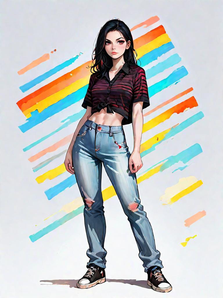 1girl, source_comics, realistic face, full body shot, Woman, trendy fashion, neon green cropped top, short sleeves, mesh insert at the waist, black pencil skirt, knee-length, fitted silhouette