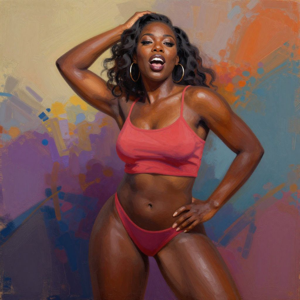 Digital painting of a confident, dark-skinned woman in red sports bra and panties, with wavy hair, large hoop earrings, and colorful abstract background