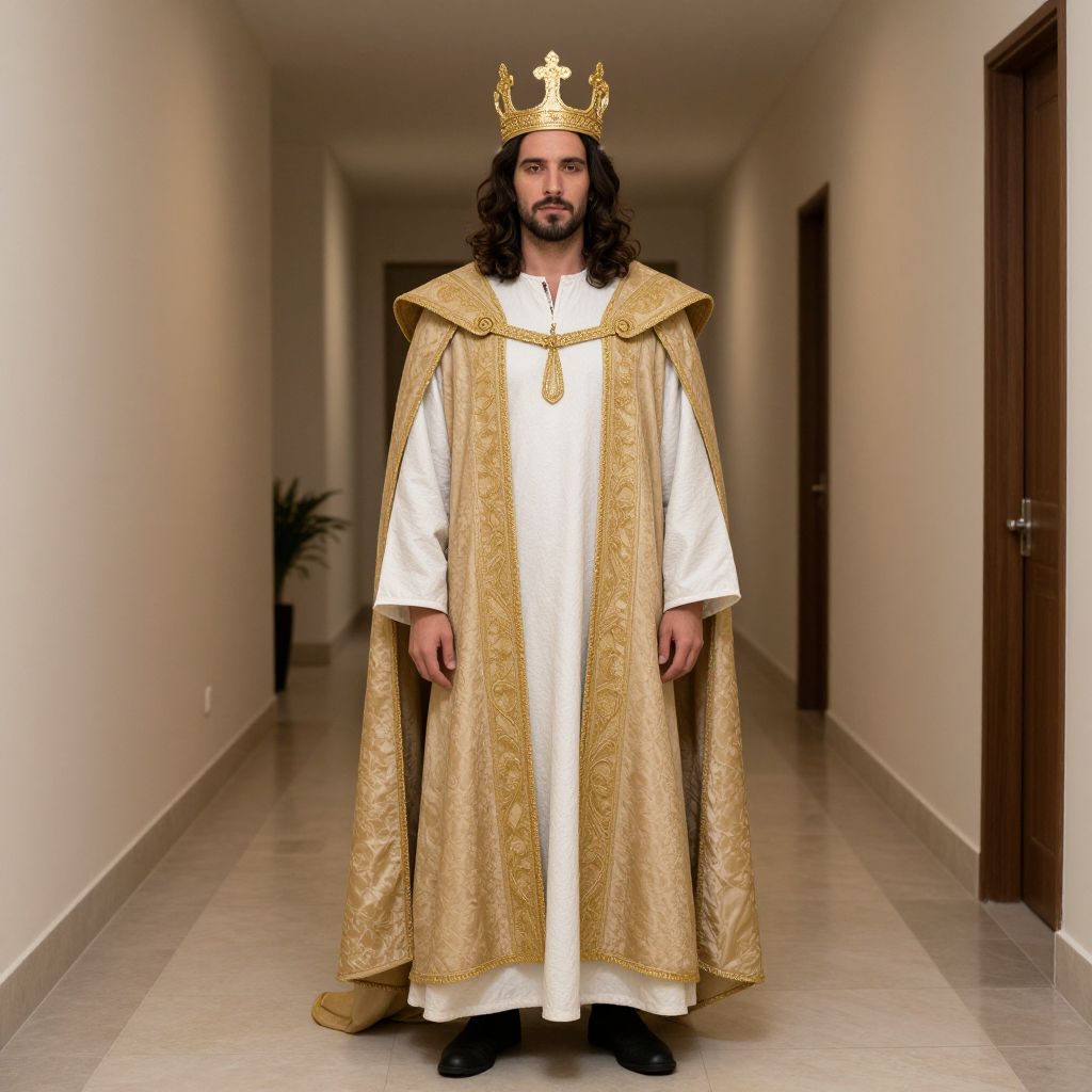 A photograph of a bearded man with long, dark brown hair standing in a long, narrow, beige hallway with white walls and a tiled floor. He wears a gold crown with intricate designs, a white robe with gold embroidery, and a gold-trimmed cape. His expression is neutral. A potted plant is in the background on the left, and a wooden door is on the right. The lighting is even, highlighting the rich textures of his attire. The overall style is regal and formal.