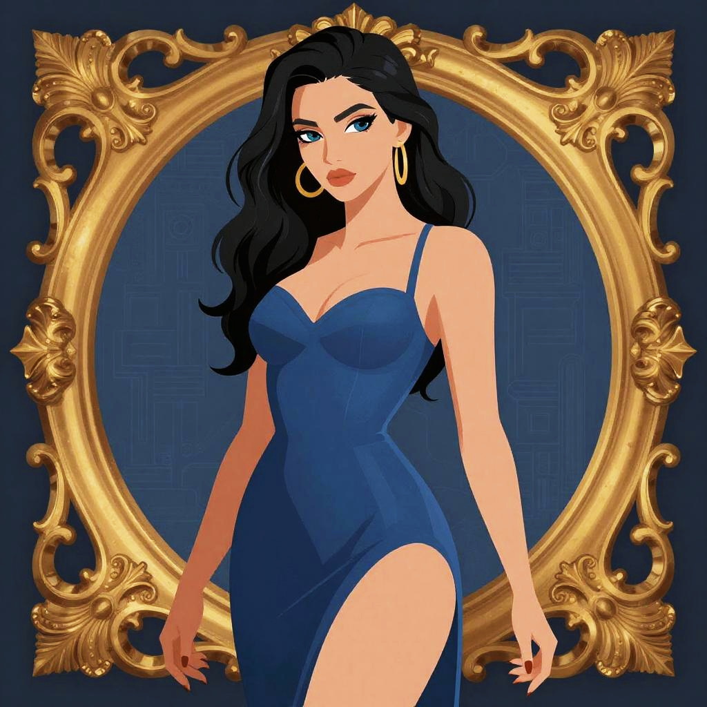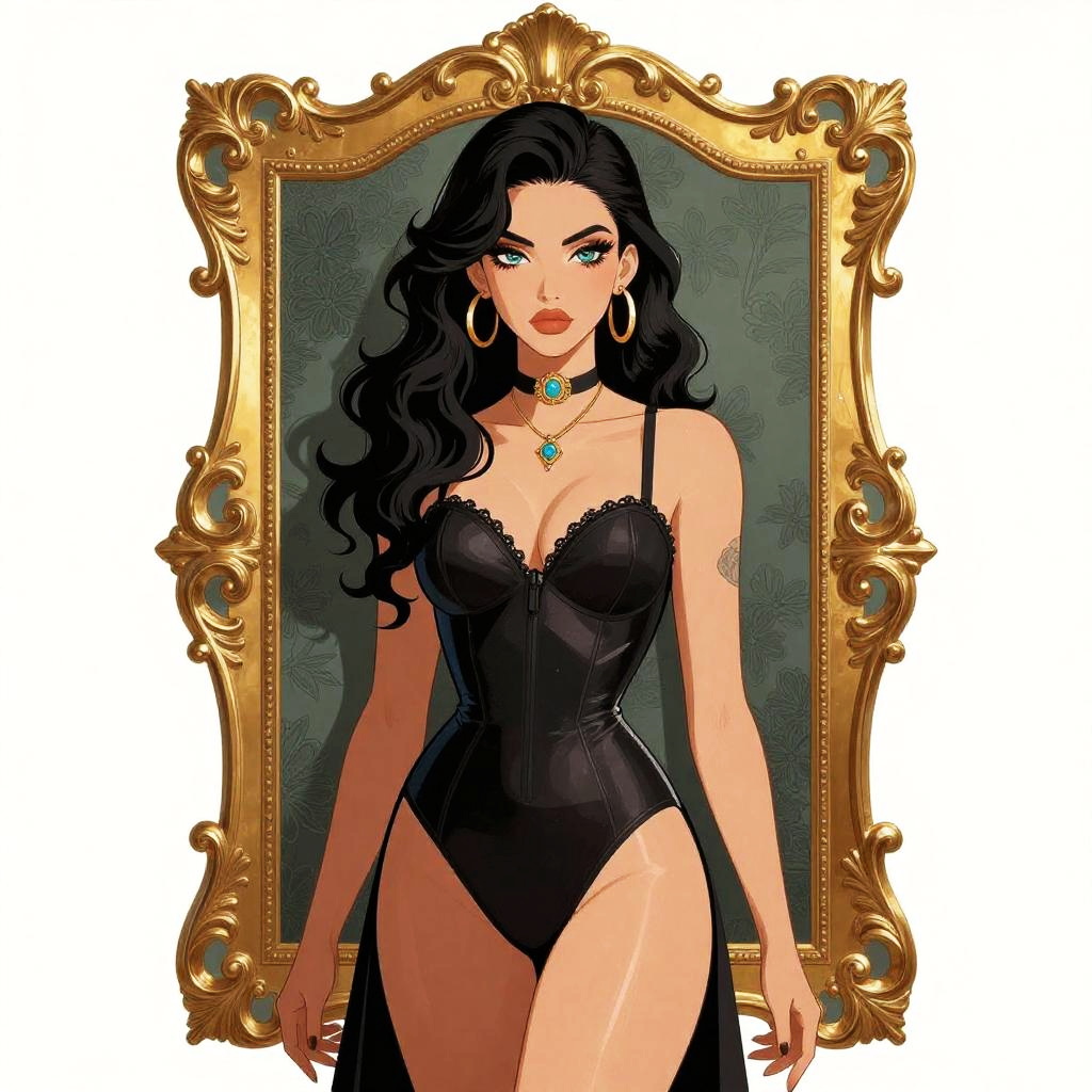Woman illustration. Cartoon, erotic vibe. Fusion of styles Baroque style and Cyberpunk style