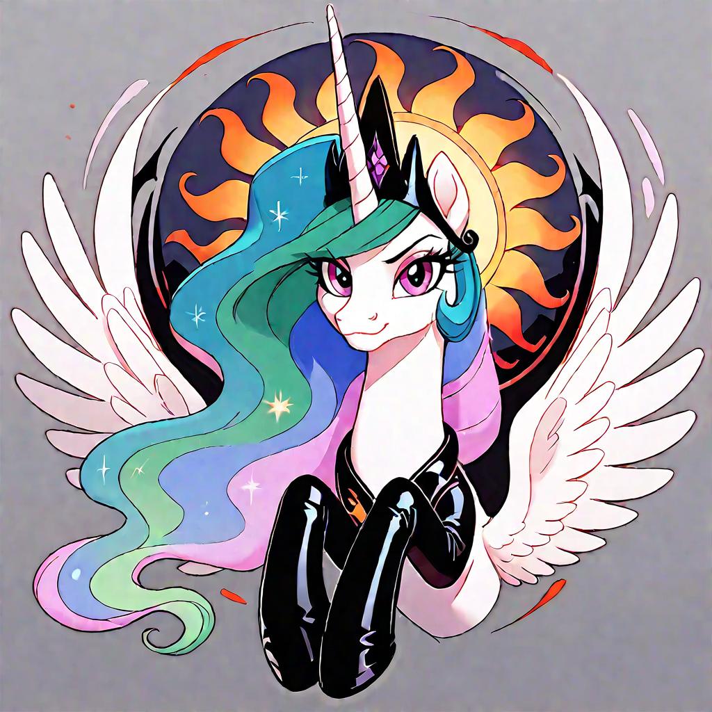 Score_9, score_8_up, score_7_up, score_6_up, score_5_up, score_4_up, (evil:1.2) Pony Princess Celestia wearing latex socks, evil black crown, looking at you, solo, beautiful, my little pony: the movie, (movie accurate:1), full body
