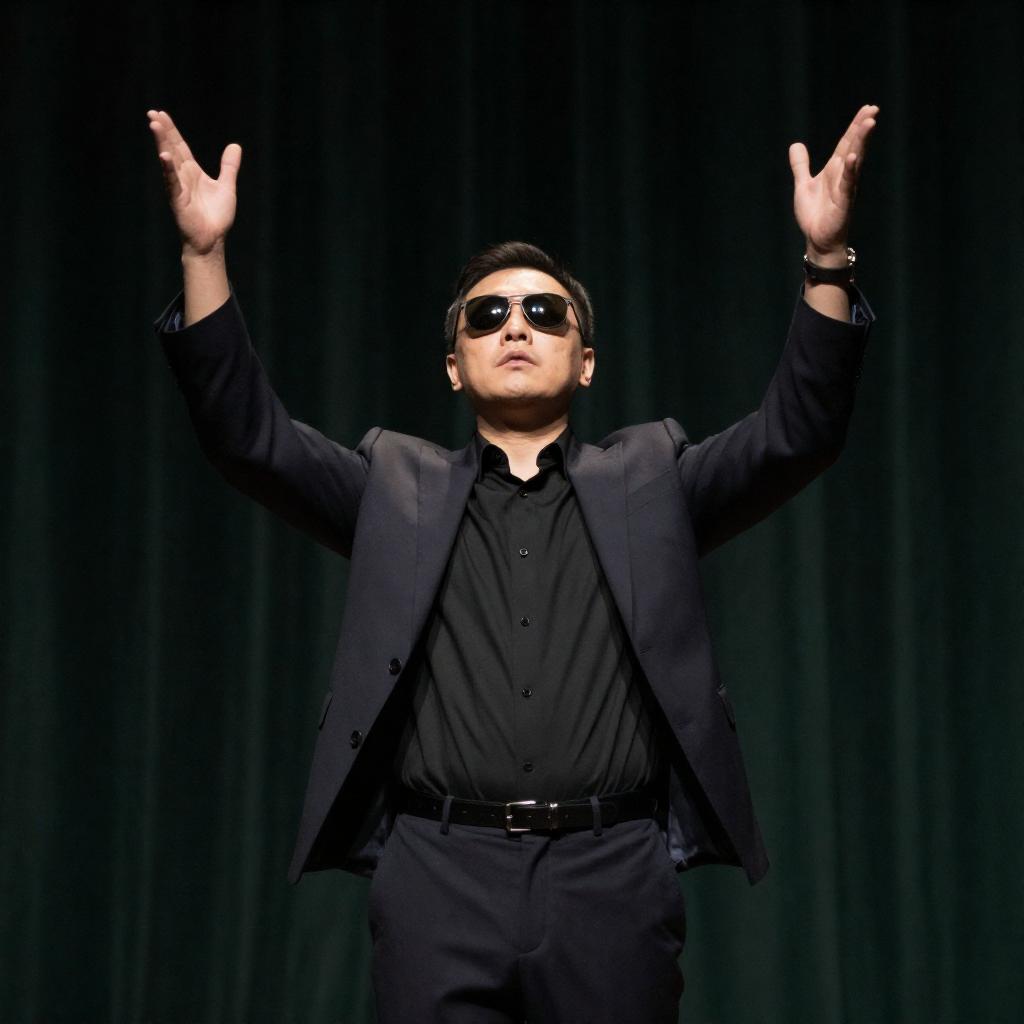 Asian man wearing a dark leather jacket and brown shirt stands on stage holding a microphone. Behind him, three ghostly, white, spectral figures with elongated arms and legs hang in the air against a black background. The scene features dark lighting and a dramatic, eerie atmosphere.