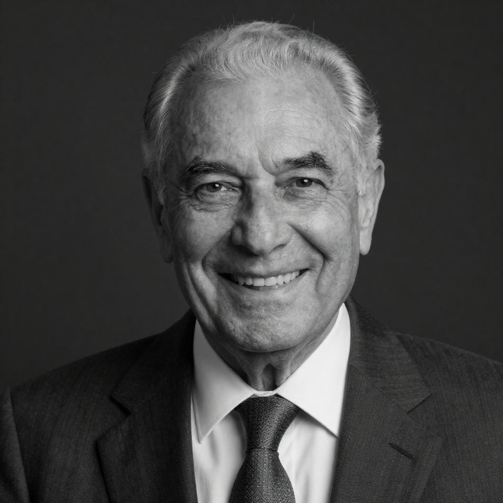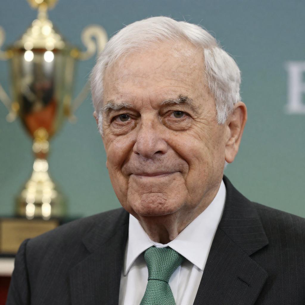 Old man with white hair, light skin, wearing a dark pinstripe suit, green patterned tie, white shirt, close-up. Blurred gold trophy in the background, soft blue and green lighting. Gentle smile, slight wrinkles, visible stubble on chin.