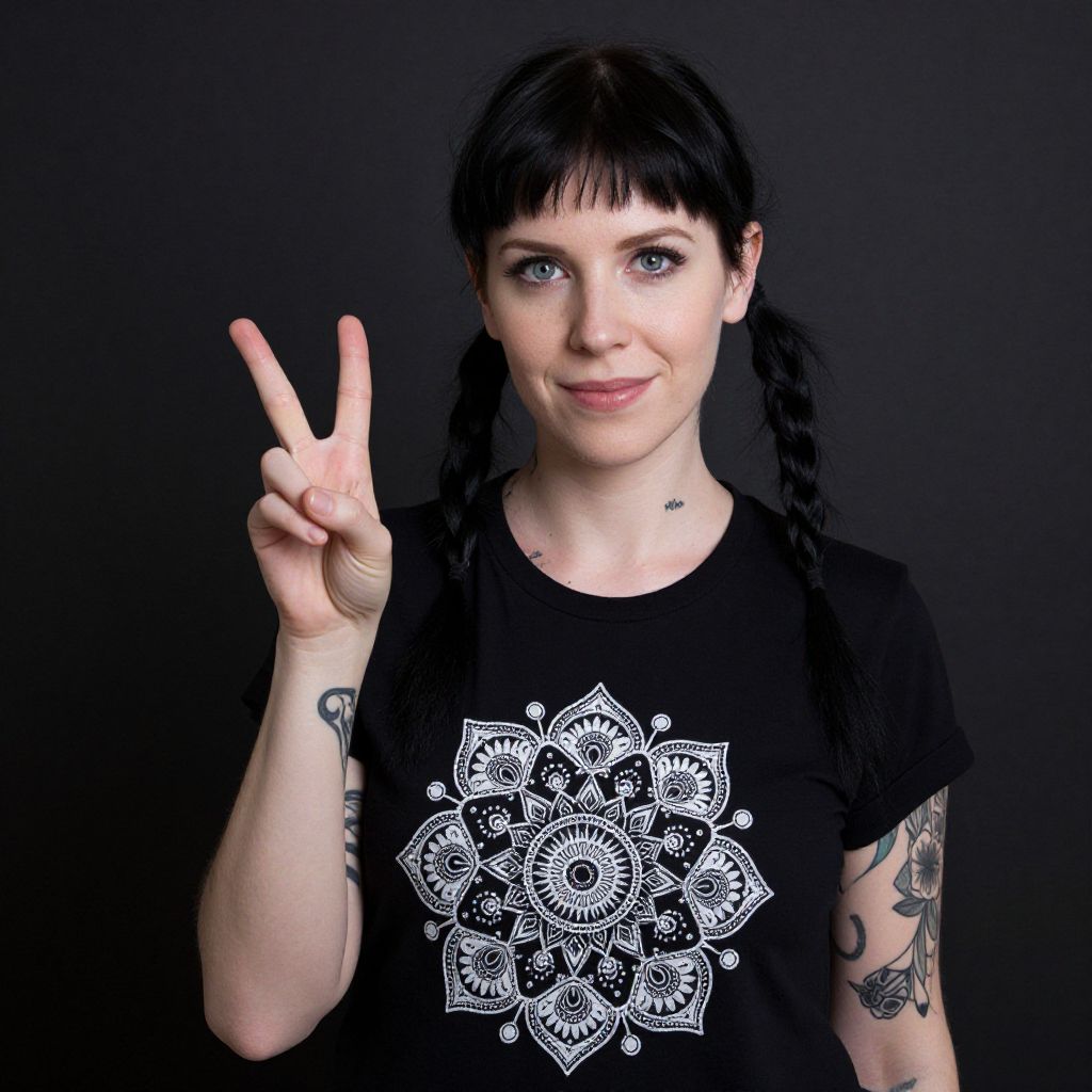 Photograph of a pale-skinned woman with black hair in pigtails, wearing a black T-shirt with a white mandala design. She has tattoos on both arms and a small tattoo on her neck. She's smiling and making a peace sign with her right hand. The background is a solid, dark color. Her expression is friendly and confident.