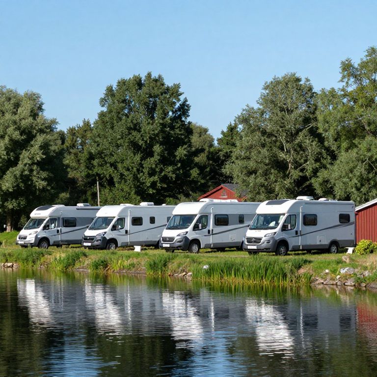 Calm waters reflect a row of white and gray RVs parked along a grassy field, surrounded by lush green trees under a clear blue sky at Nordic Camping Stensö/Cottages.