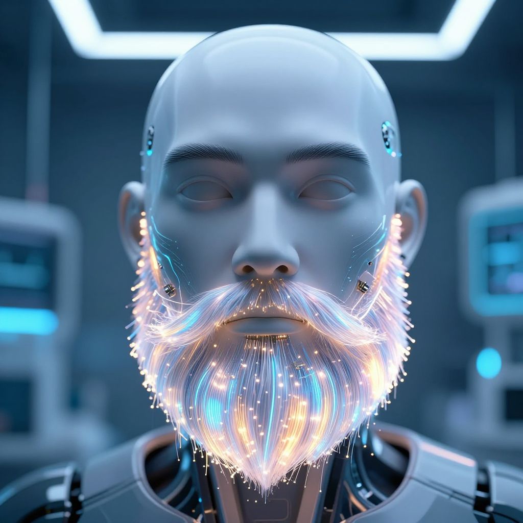 Beard AI visualization, a 3D rendered android face with synthetic beard made of fiber optics and microchips, glowing softly with dynamic light patterns, modern tech laboratory environment, high-resolution, hyper-realistic style