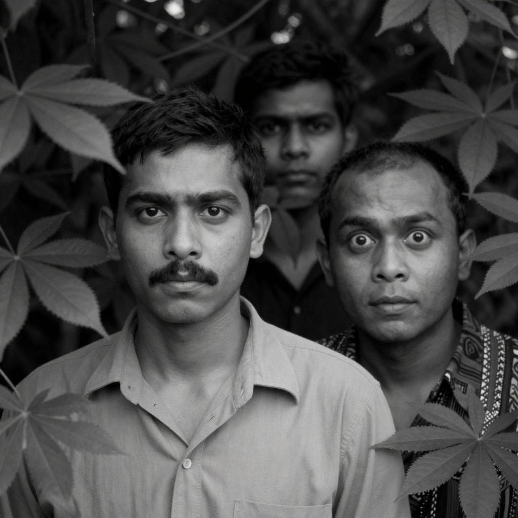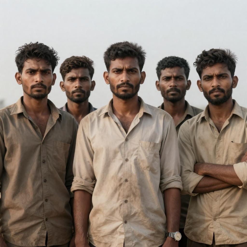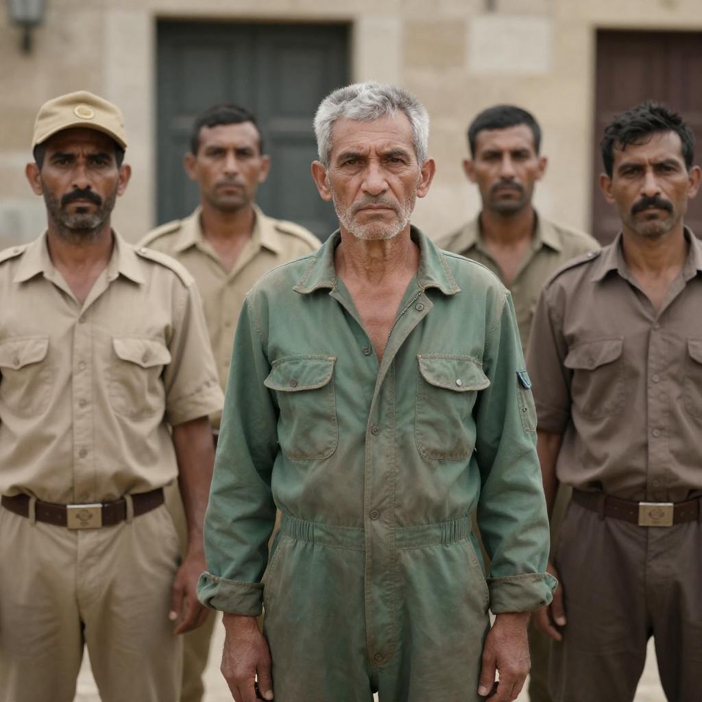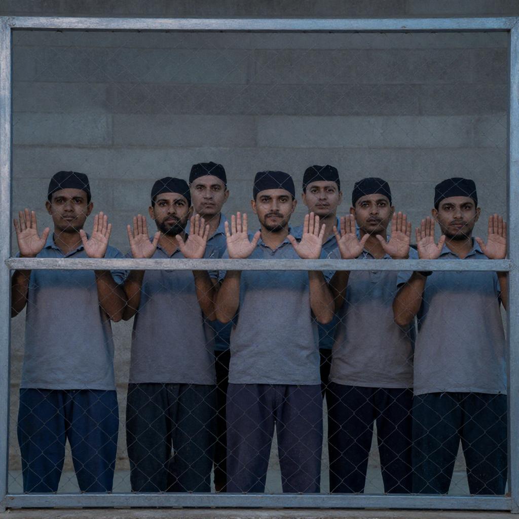 Photograph of six men in prison uniforms standing behind a chain-link fence. All men wear caps, light gray shirts, and dark pants. They press their hands against the fence, looking intently forward. Blue dusk lighting. Textured gray brick wall in background. Men's expressions are focused and determined.
