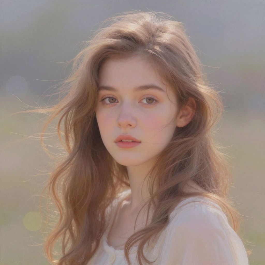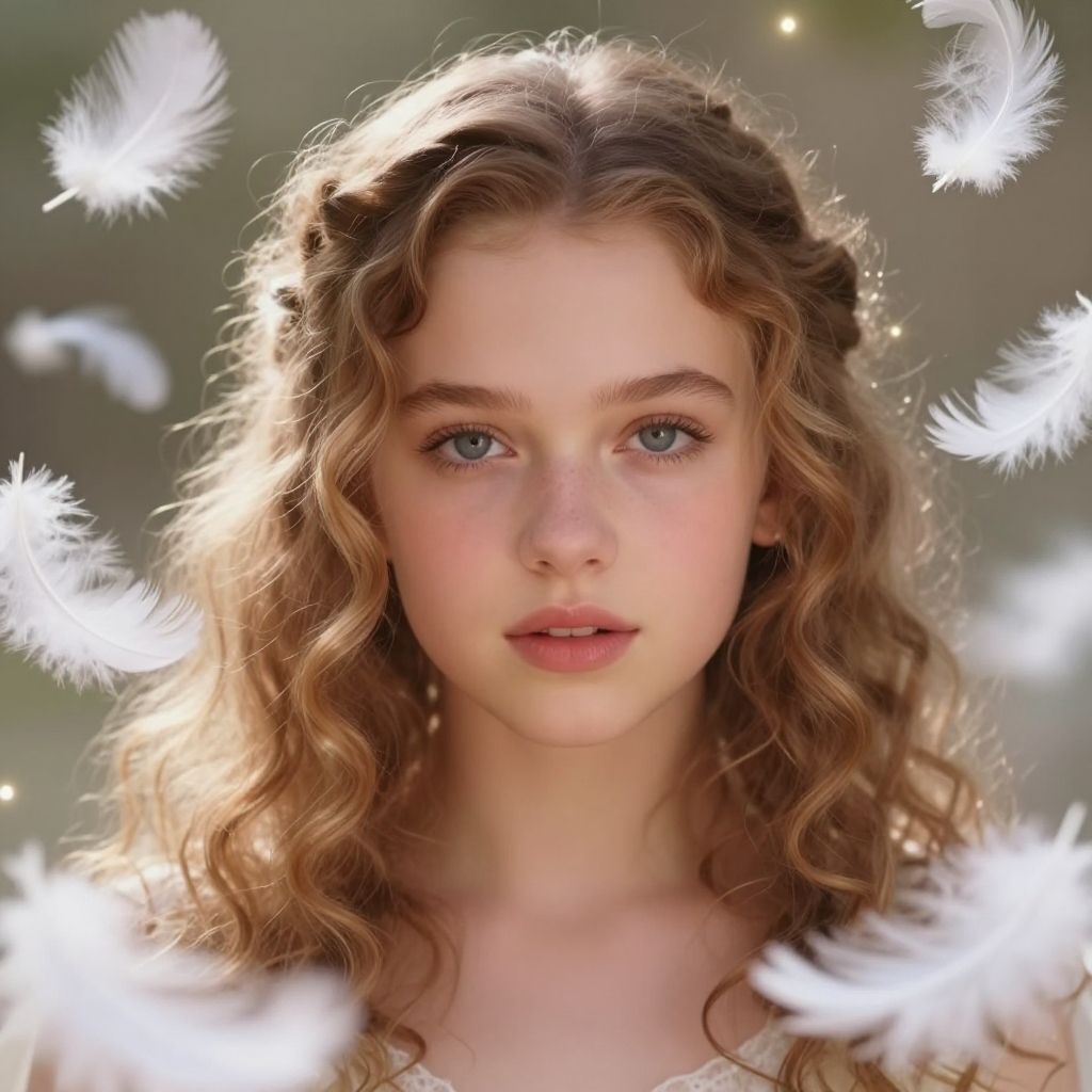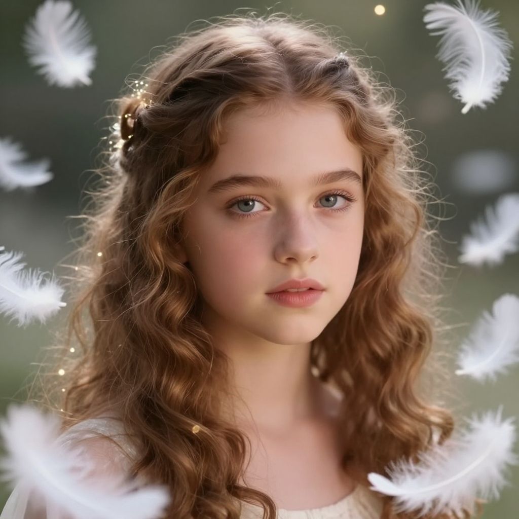 Kiernan Shipka young, angelic face with natural makeup, soft curls, surrounded by floating feathers, ethereal and magical mood, soft glow effects, fantasy portrait