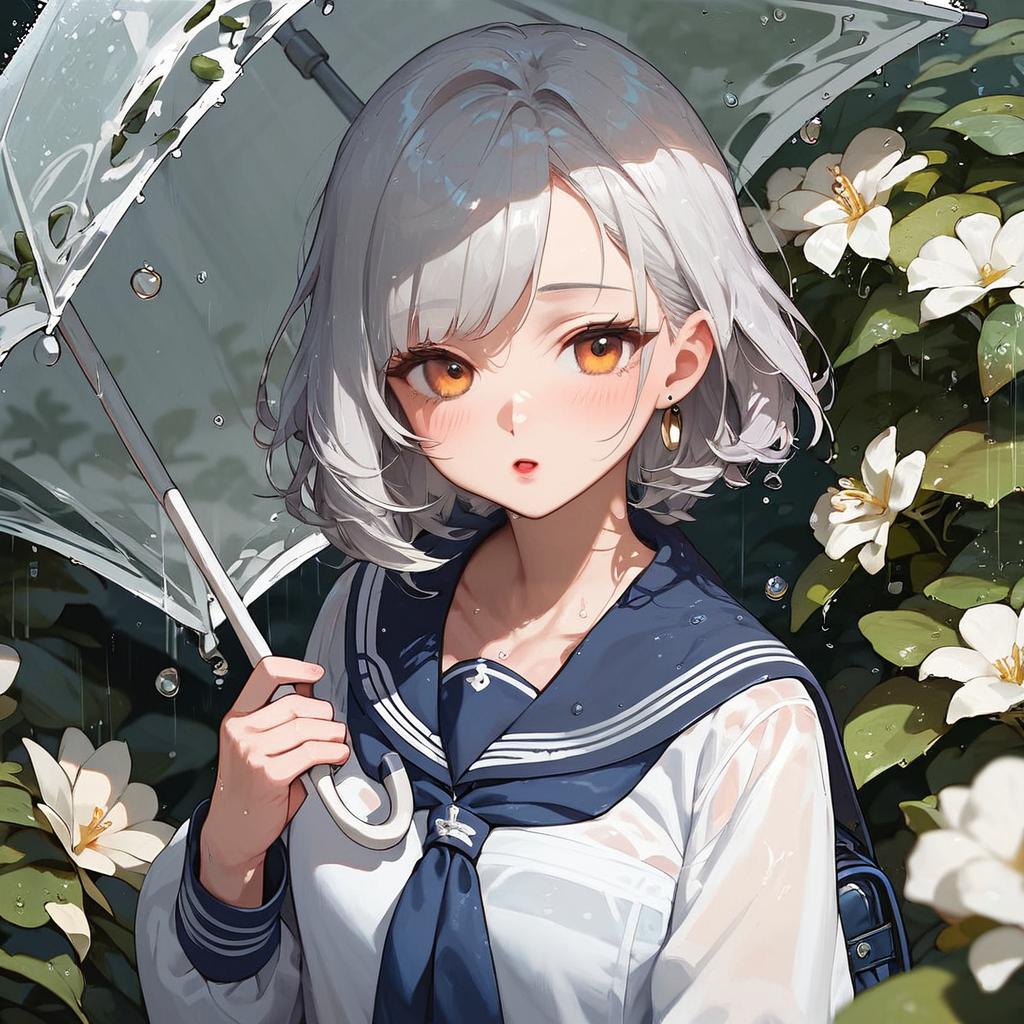 Score_9, score_8_up, score_7_up, score_6_up, score_5_up, score_4_up, masterpiece, best quality, transparent umbrella, flower, transparent, blush, umbrella, school uniform, solo, looking at viewer, holding, bangs, water drop, bag, serafuku, white flower, parted lips, sailor collar, blurry, medium hair, upper body, collarbone, outdoors, orange eyes, :o, white hair, holding umbrella, short hair, shirt, grey hair, rain, leaf