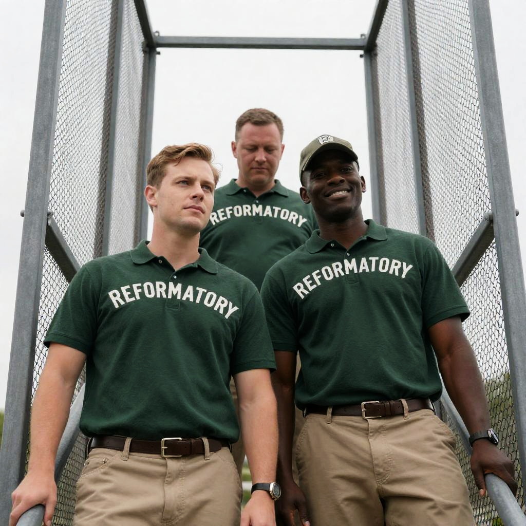 Photograph of three men in a metal cage staircase. Two white men in green shirts with "Reformatory" and numbers, one black man in a green shirt and cap, standing close. One white man looks to the left, black man smiles, white man in background looks down. Metal cage with chain link walls, overcast sky.