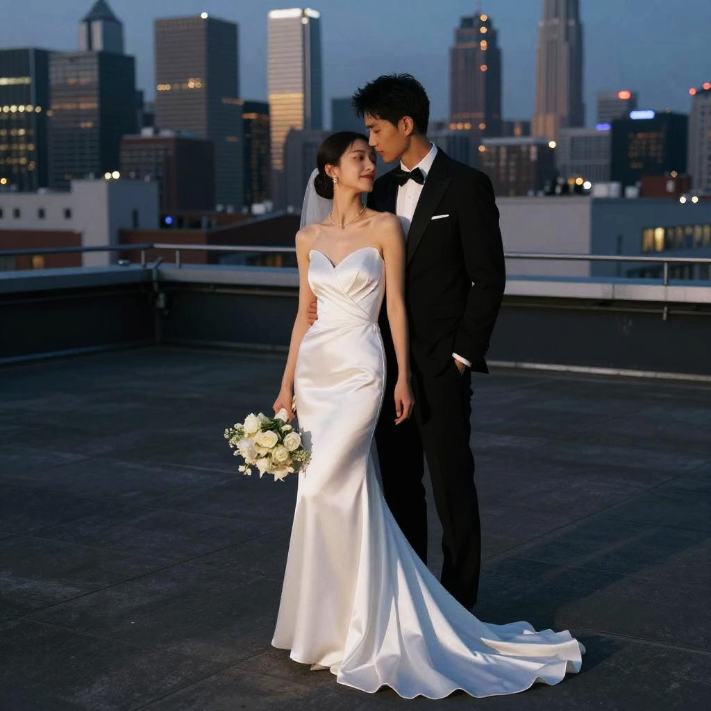 Bride and groom photos in an urban rooftop setting at twilight, city skyline glowing in the background, dramatic lighting casting soft shadows, modern wedding attire with sleek design, a blend of elegance and contemporary style, cinematic and moody atmosphere, ultra-detailed.