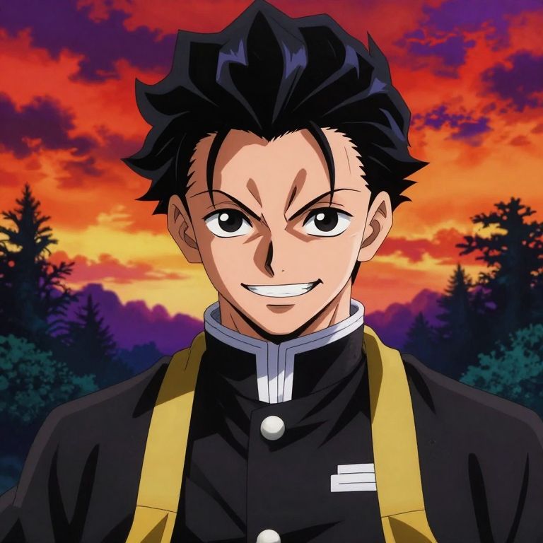 This digital anime-style illustration features a young man with spiky black hair and intense, mischievous eyes. He has a fair skin tone and is smiling widely, revealing sharp teeth. He wears a black school uniform with white buttons and a high collar, accented by yellow straps over his shoulders. The background showcases a vibrant sunset with vivid orange, red, and purple hues, silhouetted by dark, dense trees. The character's confident expression and dynamic pose suggest a sense of determination or mischief. The image is highly detailed with bold colors and sharp lines, typical of modern anime art.