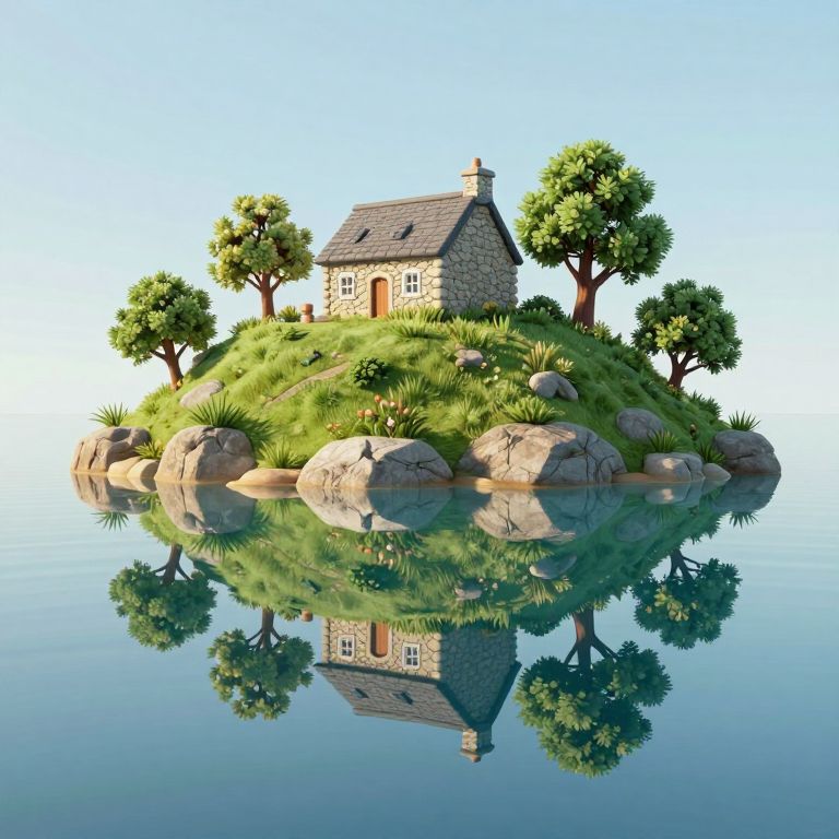 Digital illustration of a small, stone cottage with a gray, sloped roof and a single chimney, situated on a lush, grassy island surrounded by large rocks. Four green, leafy trees stand around the cottage, their reflections perfectly mirrored in the calm, blue water below. The bright sunlight casts gentle shadows, enhancing the serene, idyllic atmosphere. The clear sky above is a gradient of light blue, adding to the peaceful, isolated setting. The cottage has a simple, rectangular shape with a wooden door and small, square windows.