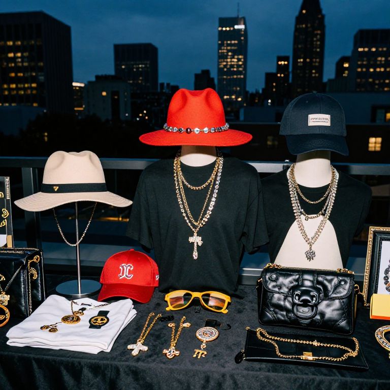 Street style accessories at a rooftop fashion event in a modern metropolis, midnight glow, city skyline background, curated collection of bold hats, layered necklaces, and leather goods, fusion of streetwear and luxury, dynamic composition, high contrast, vivid colors