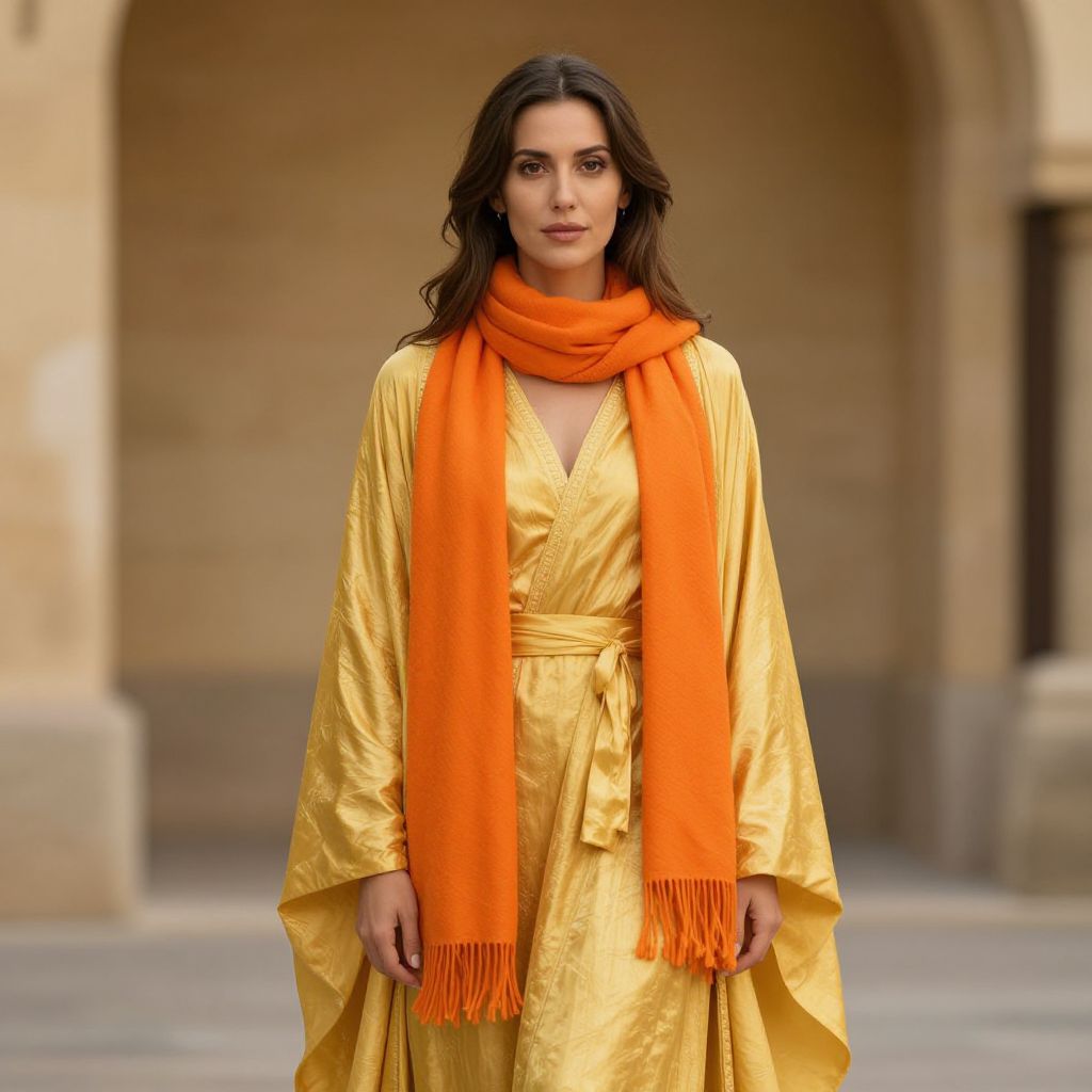 Photograph of a young woman with wavy brown hair and fair skin, standing in front of a blurred stone archway. She is wearing a shiny, gold-colored, long-sleeved, V-neck dress with a tied waist, and a vibrant orange scarf draped around her neck with fringed ends. Her expression is neutral, and she gazes directly at the camera. The background consists of beige and brown stone textures, adding a historical or architectural feel to the image. The overall style is elegant and traditional, with a pop of bright orange contrasting against the gold and neutral tones.