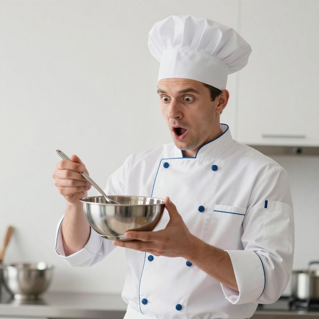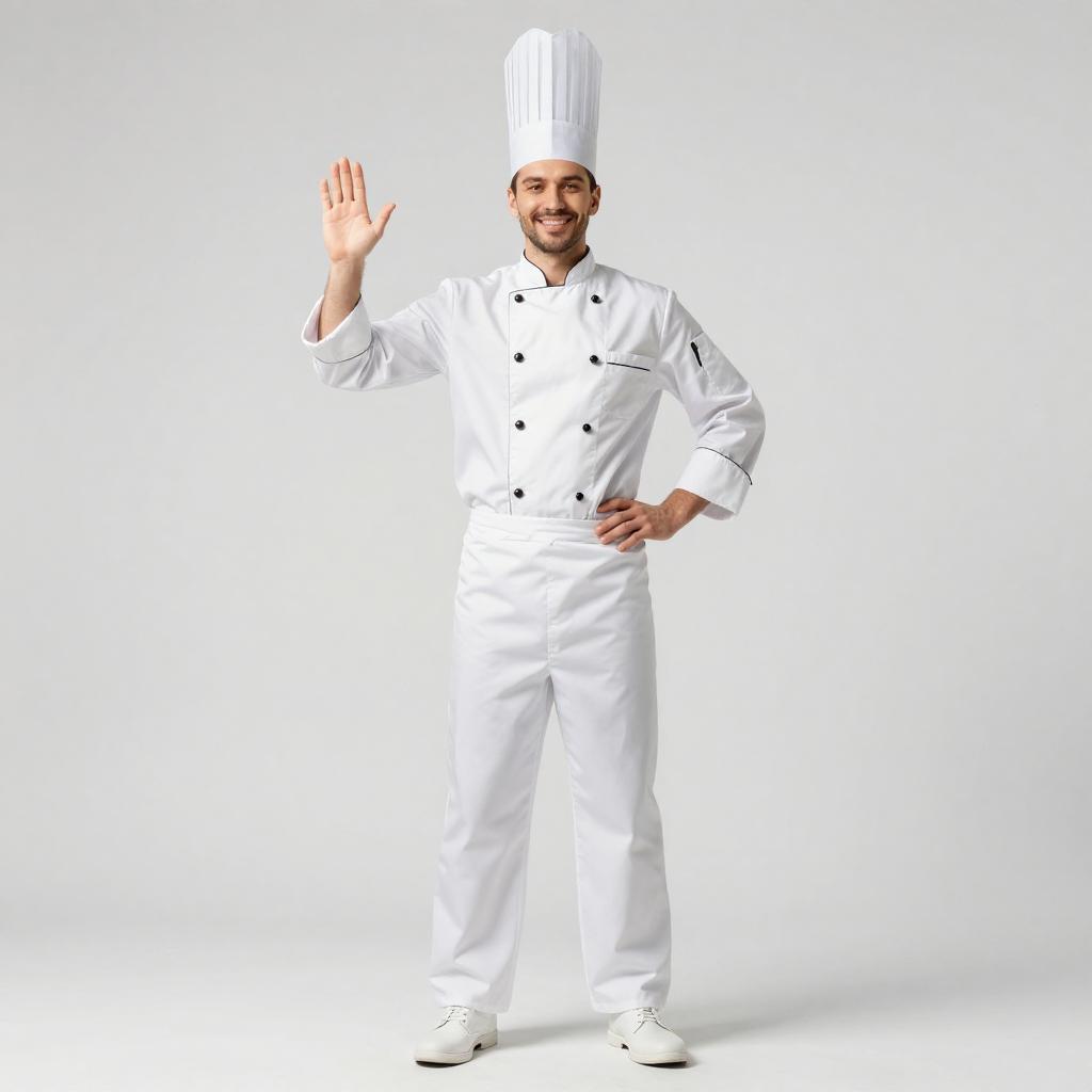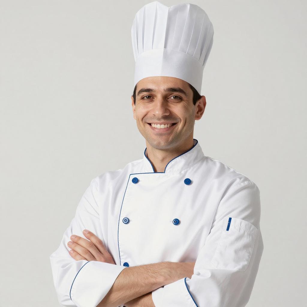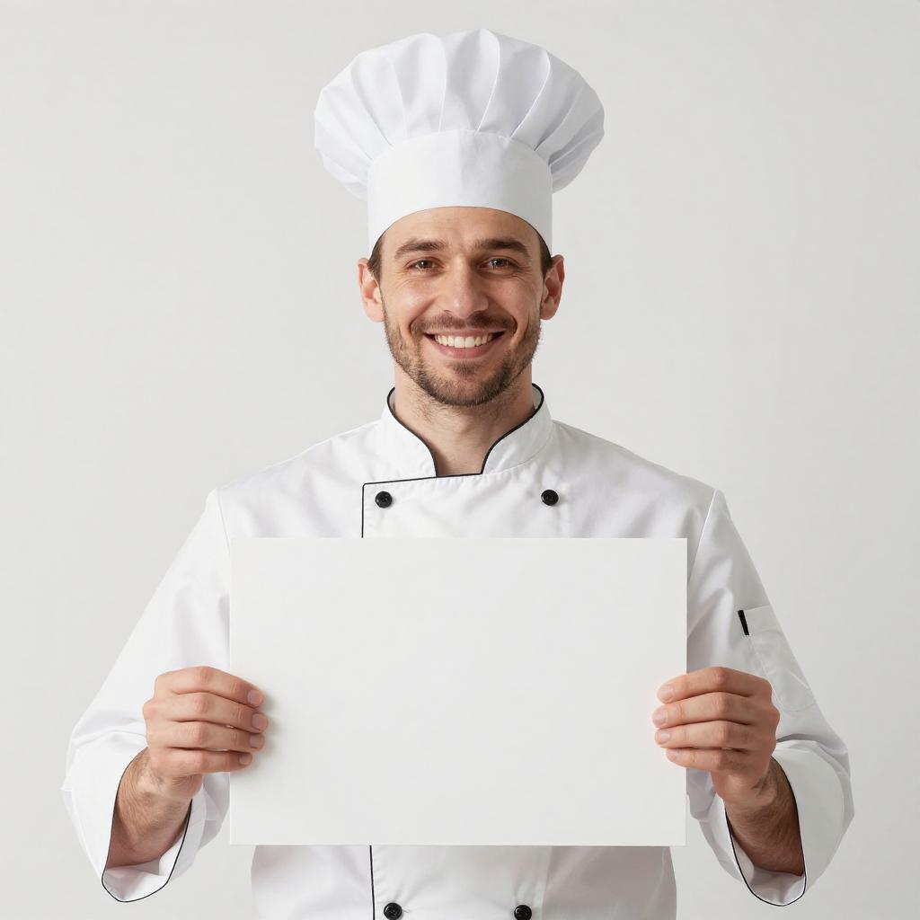 Photograph of an older, bearded male chef with a white chef's hat and blue neckerchief, smiling and pointing with his right hand. He's wearing a white double-breasted chef's coat with blue buttons. In the foreground, there's a colorful assortment of fresh vegetables including carrots, tomatoes, bell peppers, and onions on a wooden cutting board. The background is white and blurred, with hanging pots and pans slightly in focus. The lighting is bright and even, with a shallow depth of field that keeps the chef in sharp focus. Camera angle is eye-level.