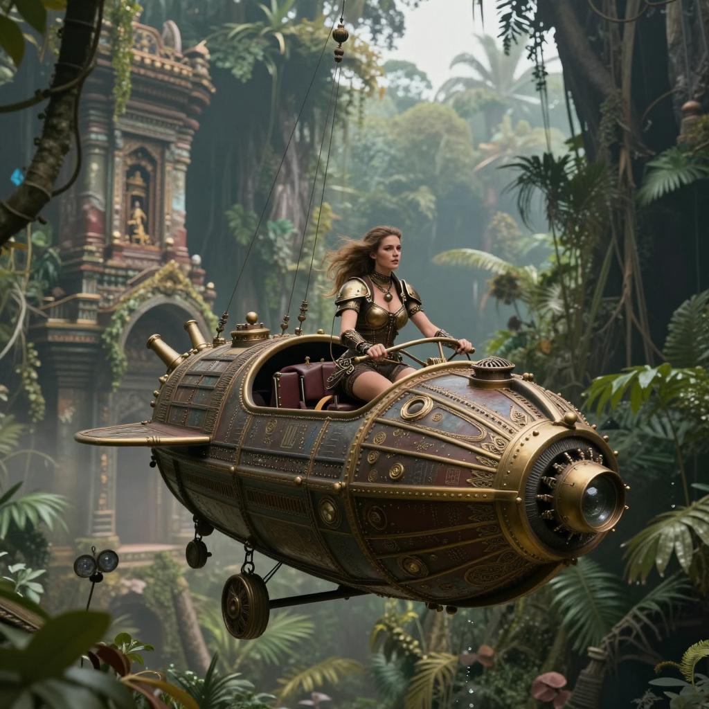 A steampunk woman piloting a ornate flying airship through dense jungle with ancient ruins, fashion photography, glam art, cinematic drama, epic scale, exquisite detail, 30-megapixel 4K, 85 mm lens, sharp focus, f/8, ISO 100, 1/125 s shutter, diffuse back-lighting, award-winning composition.