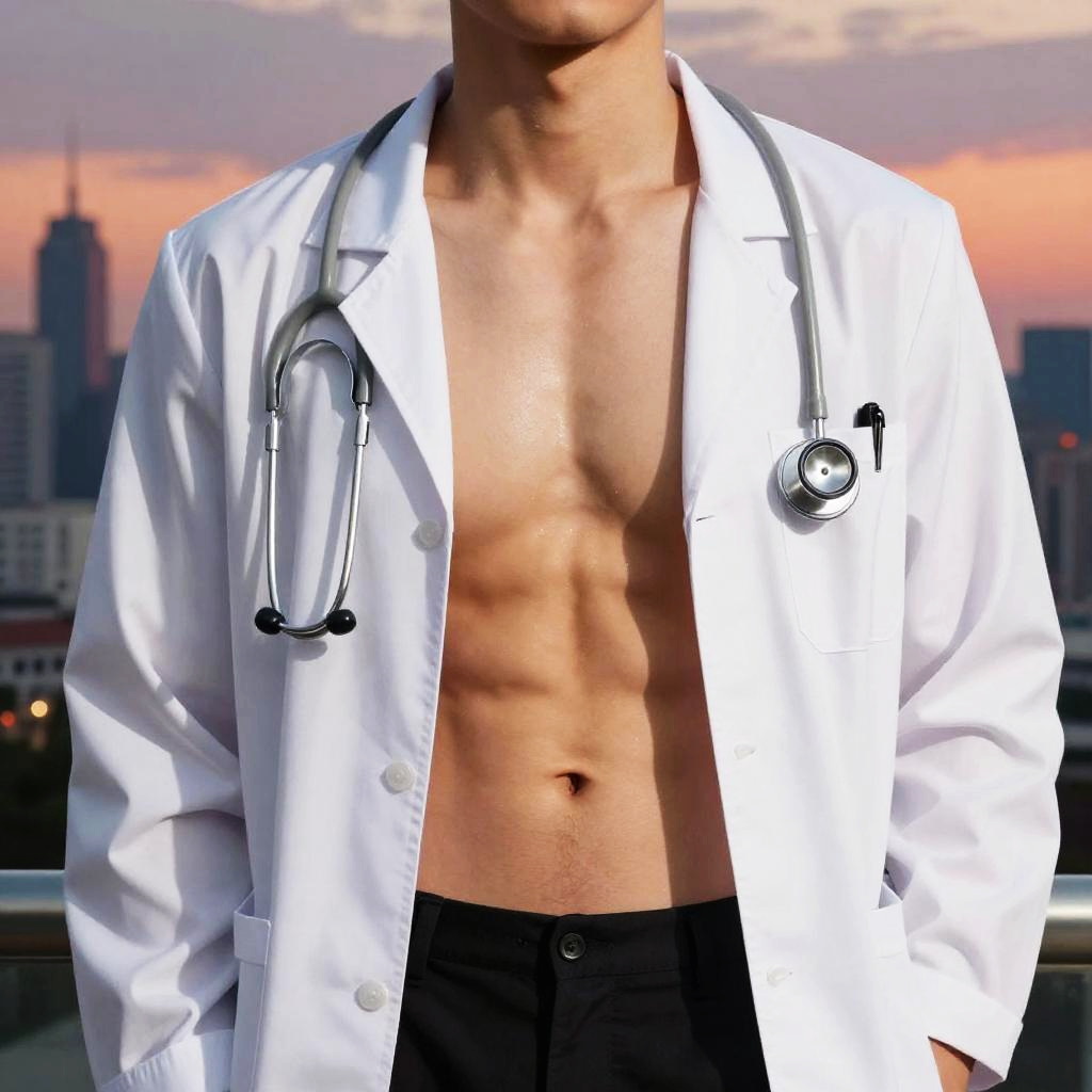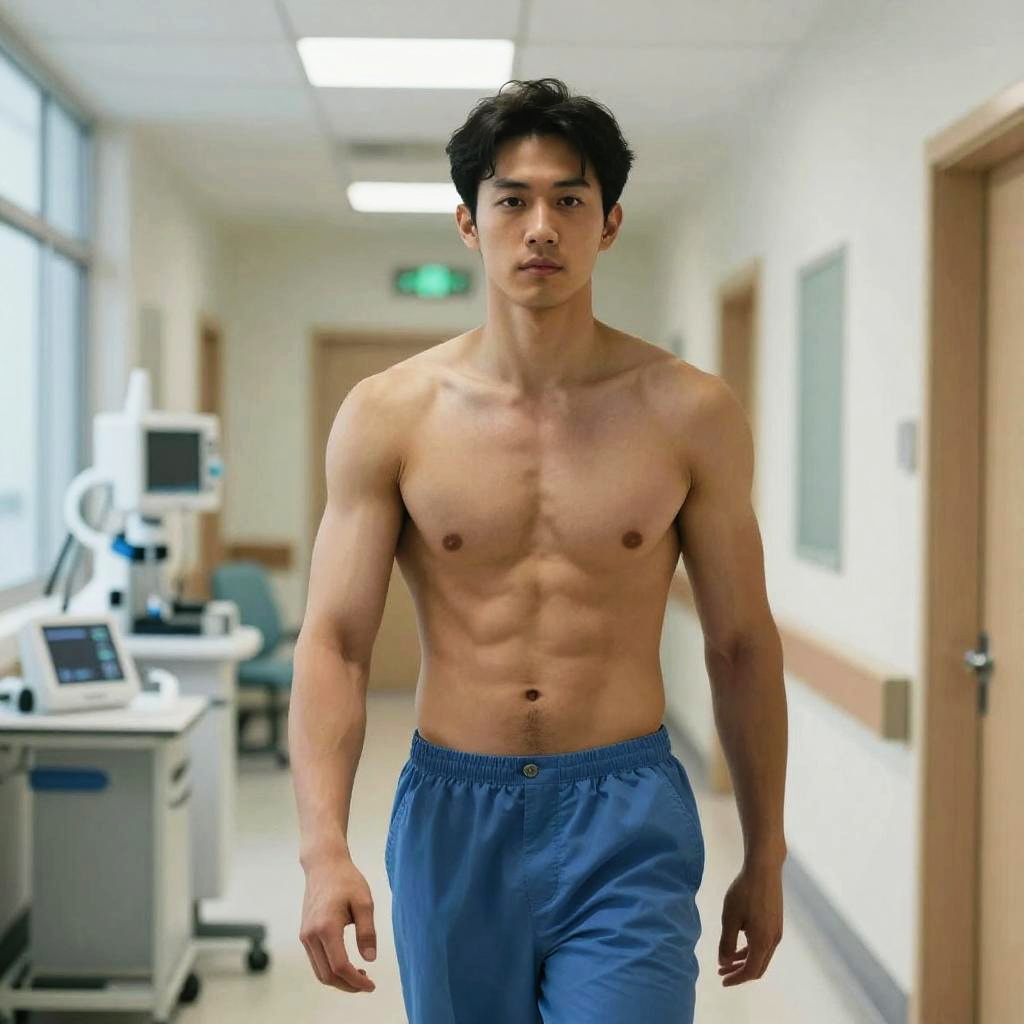 Shirtless doctor walking through an emergency room filled with activity, muscles defined under soft fluorescent lights, medical monitors and busy staff in the background, dynamic composition, realistic digital painting style