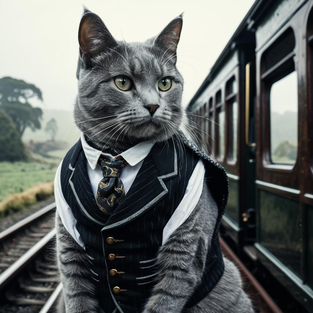 A gray cat wearing a vintage pilot suit with goggles riding a train through an ancient Japanese village during cherry blossom season with lanterns glowing at twilight, Hollywood movie style, hyper-realistic, 8K resolution, natural lighting, cinematic composition