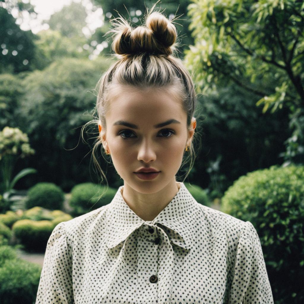 Messy Bun hairstyle on young woman, wearing floral dress, in botanical garden, captured in fashion editorial style with soft afternoon glow.
