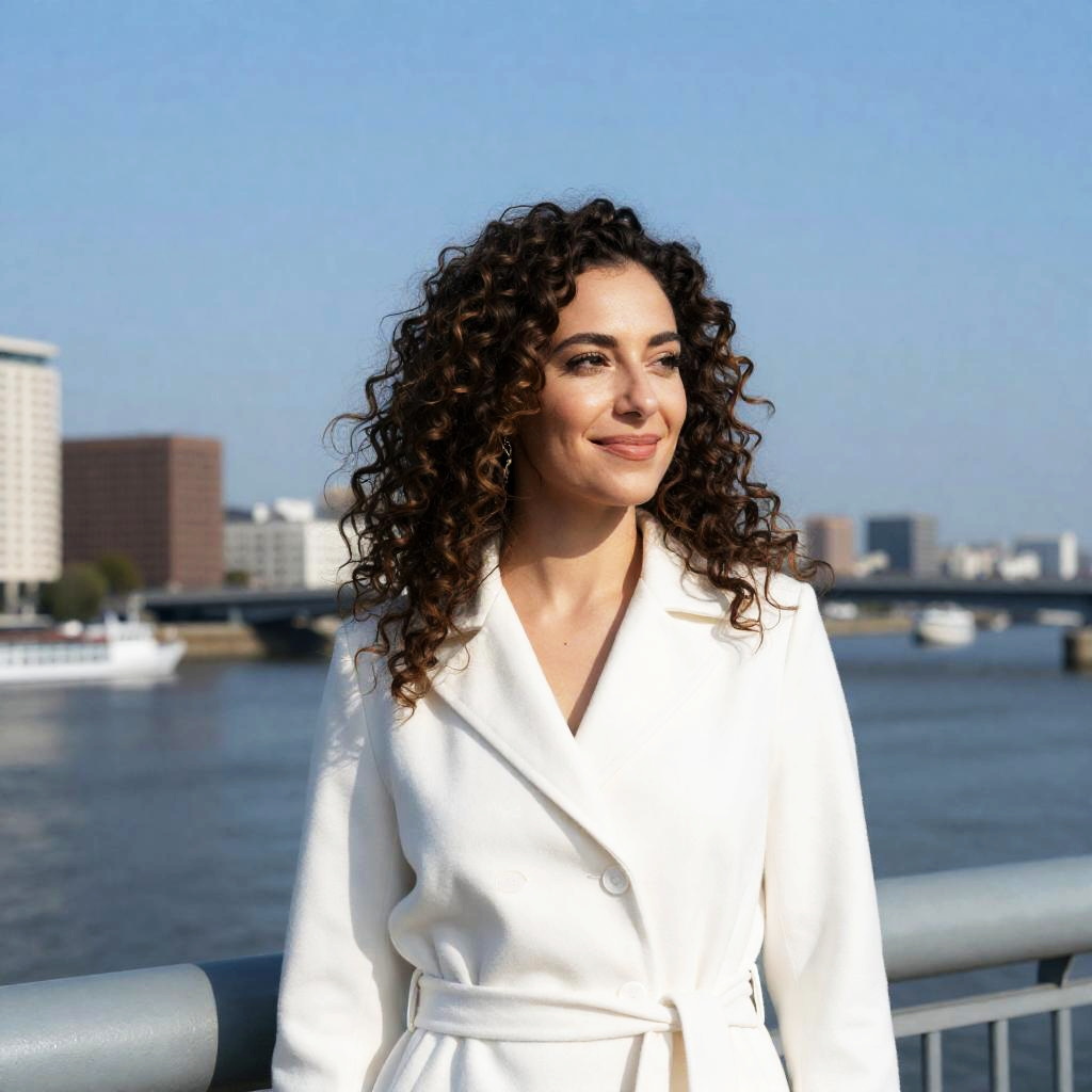 Photograph of a woman with wavy brown hair wearing a blue coat, purple scarf, and black backpack. Brown leaves are falling around her. She stands near a gray stone building with a glass window in the background. She looks to the right. Daylight illuminates the scene.