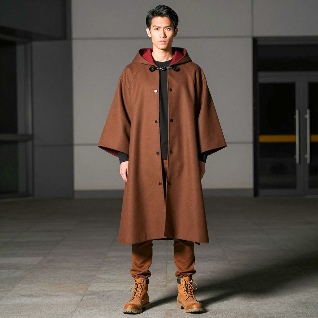 Finesse clothing costume, photorealistic, male model, Asian, short black hair, serious expression, standing, wearing long brown cloak with red lining, brown pants, brown lace-up boots, indoor, modern building background, dim lighting, night, full body shot, plain background, focus on model, slight shadow, realistic ures, casual fashion, minimalistic, soft lighting, neutral colors