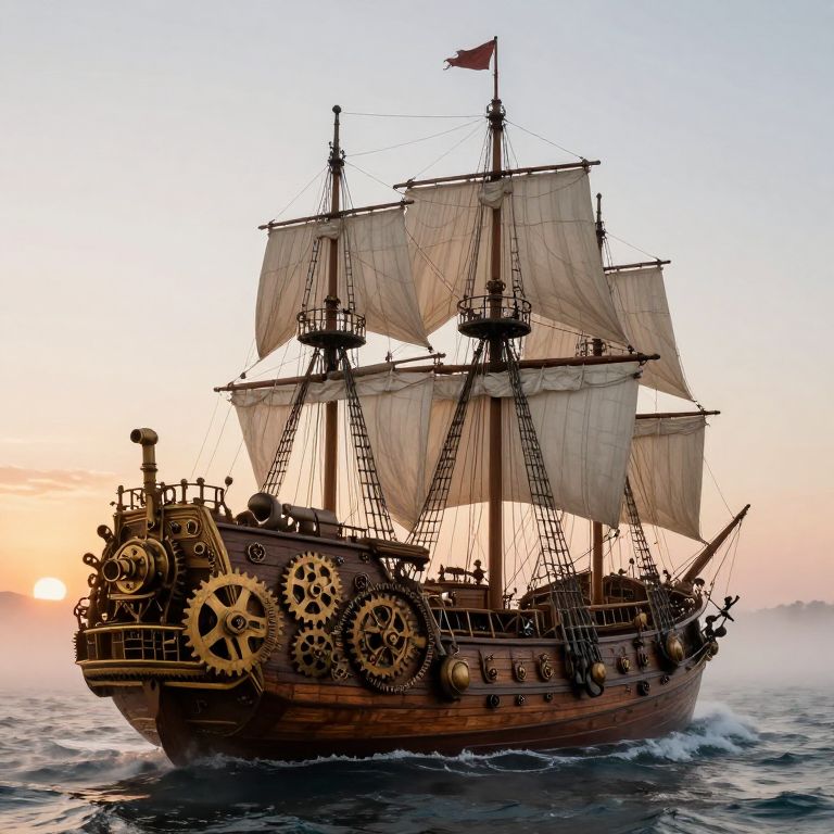 Shipit traditional wooden sailing ship transformed into a steampunk vessel, adorned with gears and steam pipes, sailing through misty ocean waters with a sunset horizon, intricate Victorian details combined with industrial machinery, fantasy adventure mood.