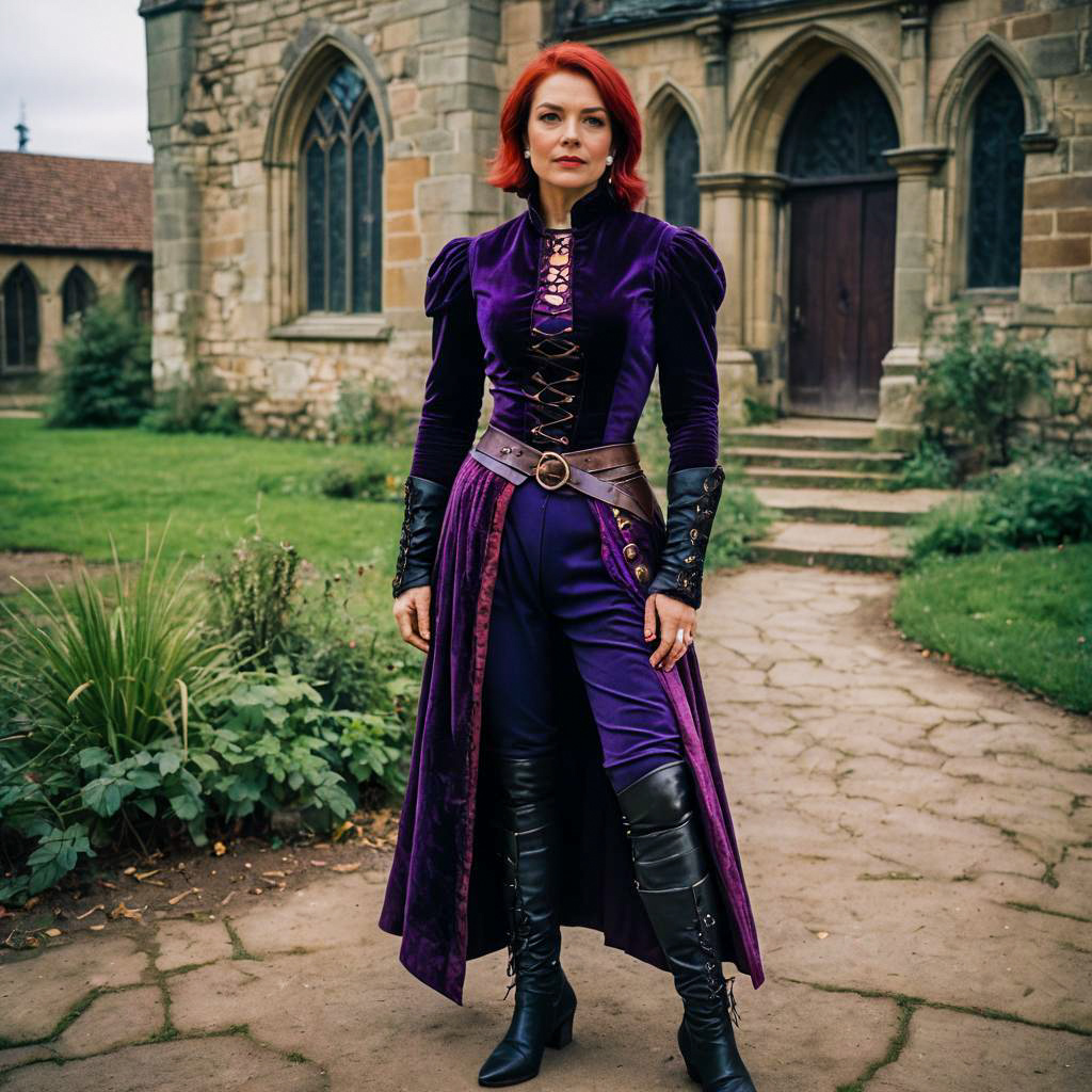 A muscular woman with red asymmetrical bob hairstyle wearing a velvet renaissance fair outfit featuring a Tyrian purple doublet with vermilion lace-up bodice and a flowing skirt. She is dressed in knee-high black boots and standing on a dirt path beside a historic stone structure surrounded by greenery.